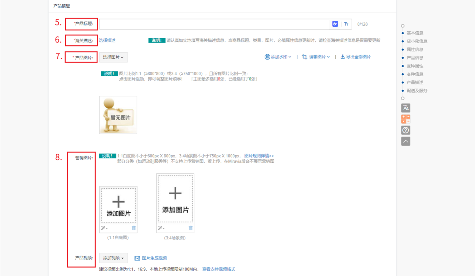 视频:支持单个产品,编辑上传,支持本地、网络、Miravia视频库选择上传