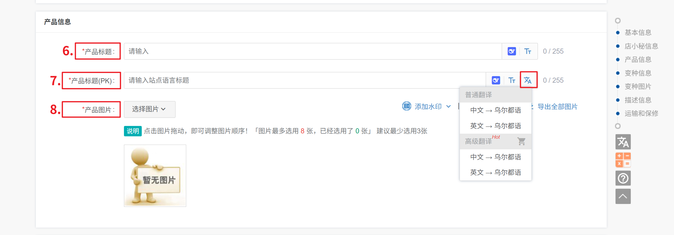 6、产品标题:需填写英文,可输入中文,点击一键翻译,翻译成英文