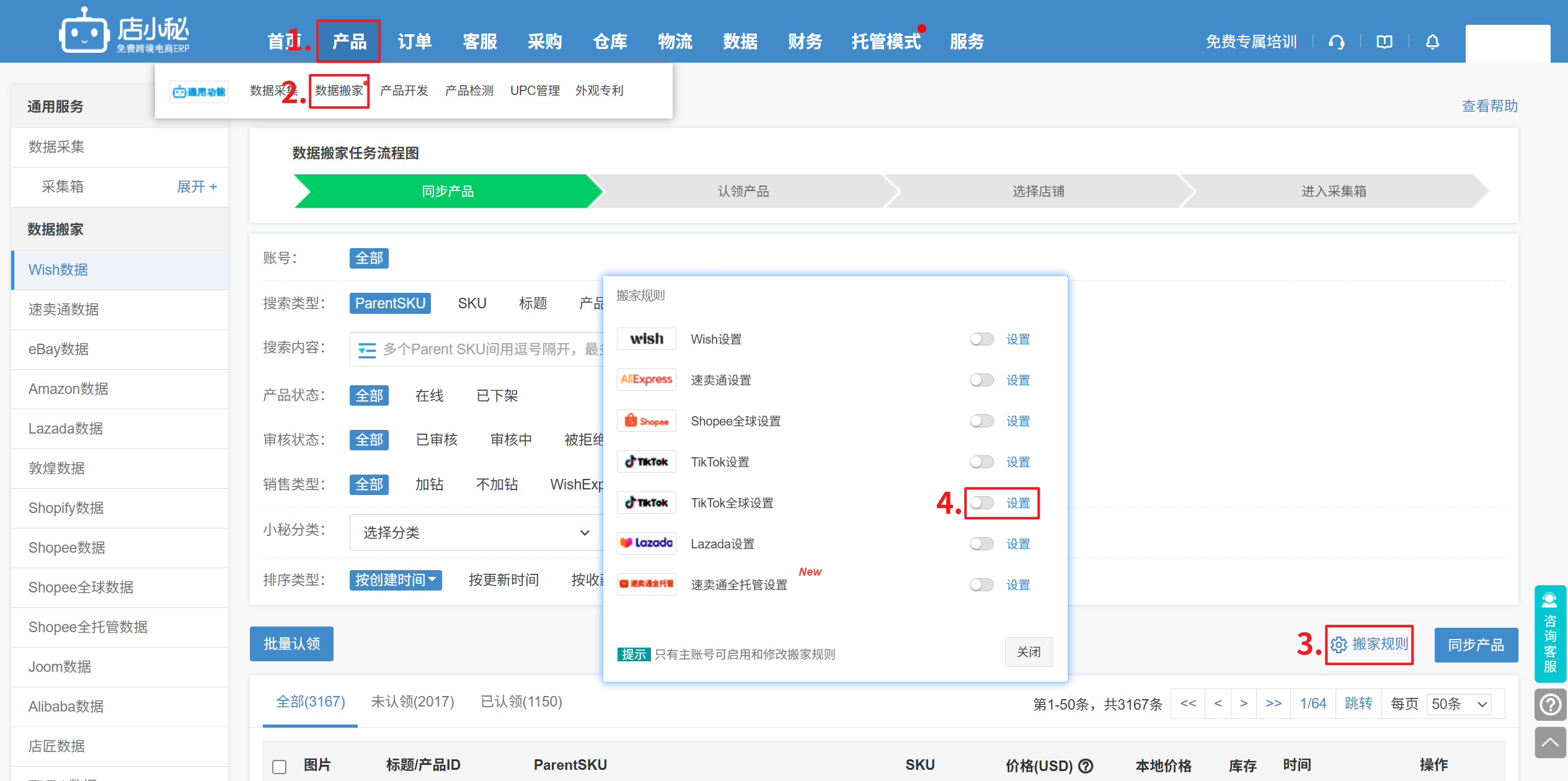 第一步:【产品—数据搬家—搬家规则—TikTok全球—点击设置】