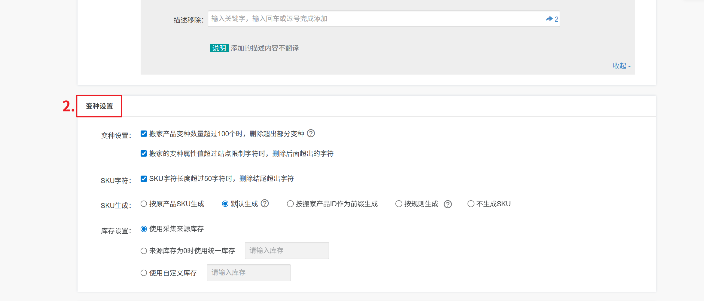 SKU生成:① 按原产品SKU生成:则按搬家的原产品SKU默认生成
