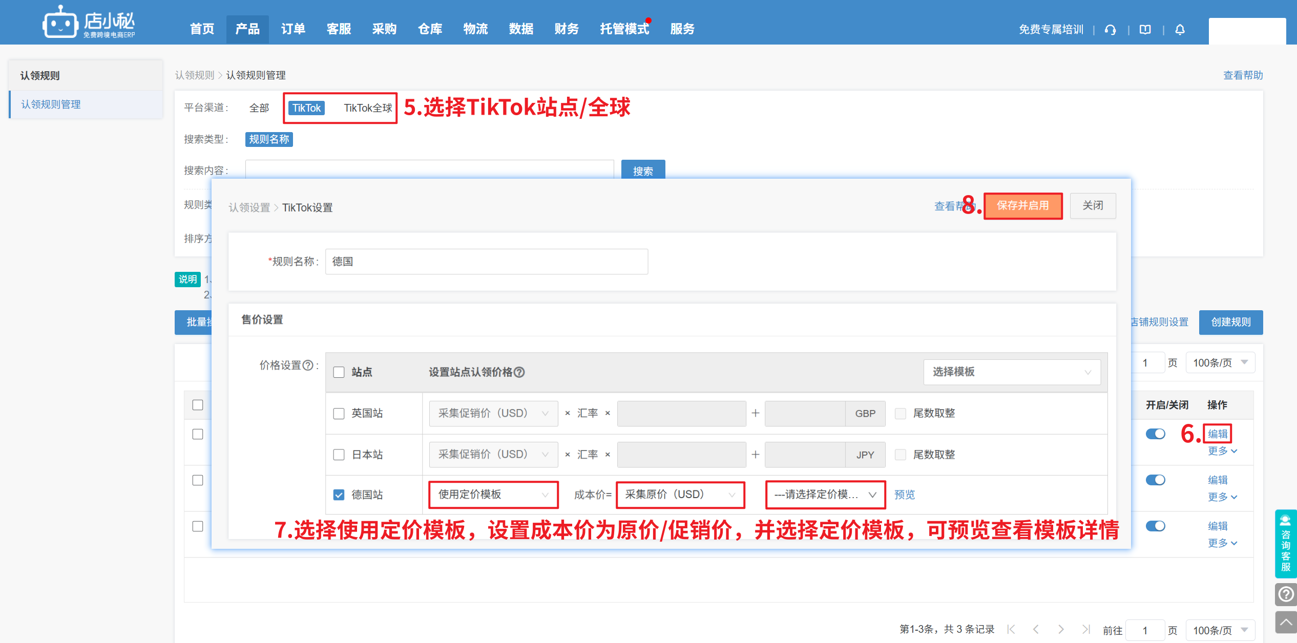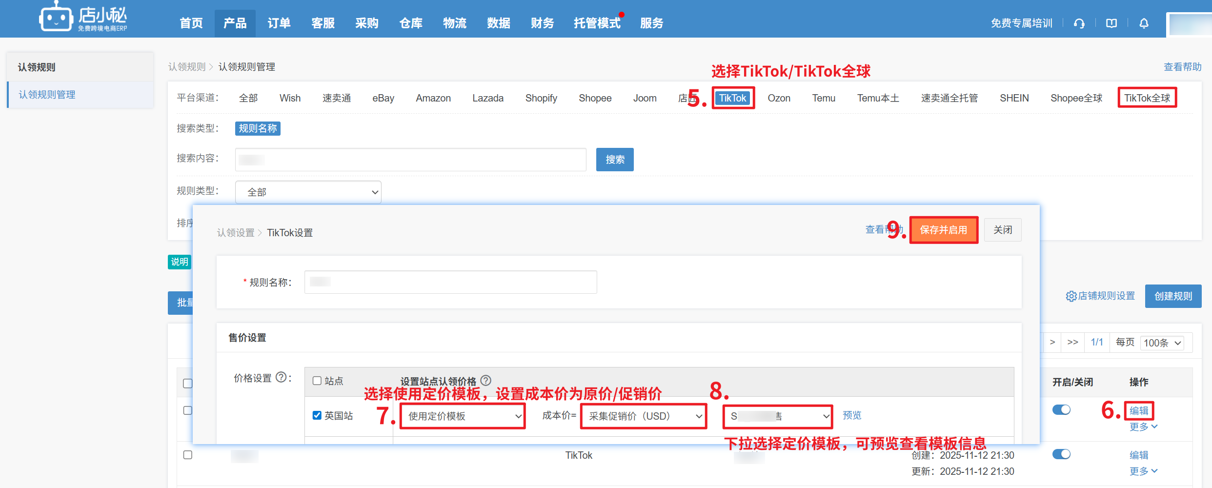 —选择定价模板—保存,将产品认领到TikTok/TikTok全球采集箱时,会自动按定价模板计算售价】