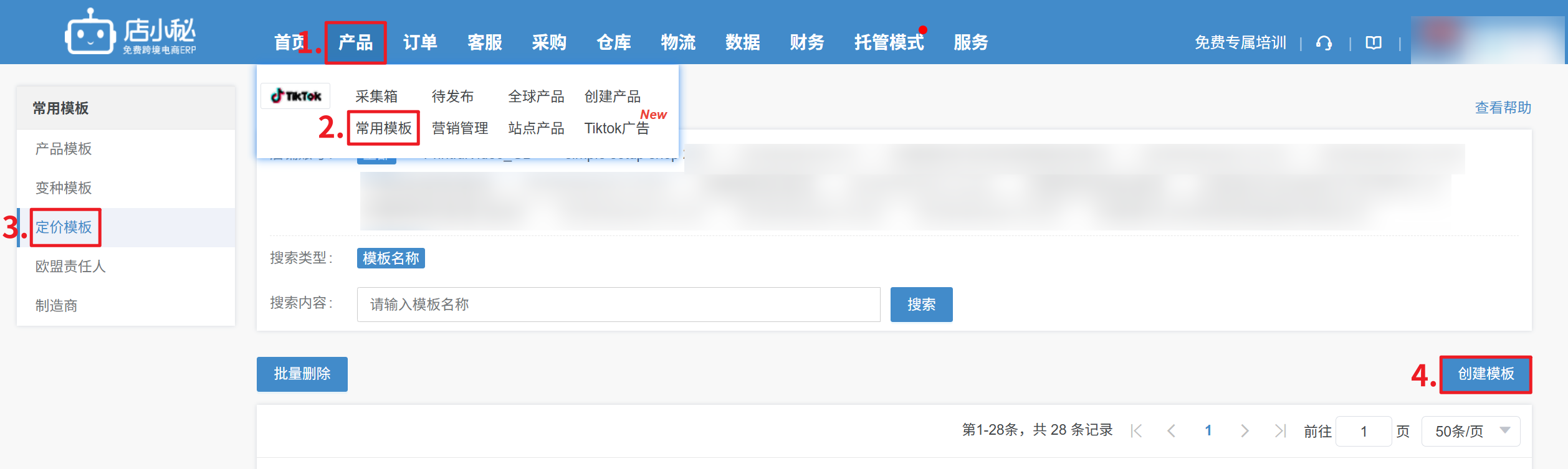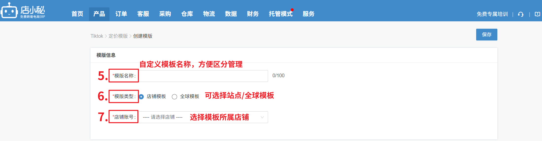 【产品—TikTok常用模板—定价模板—创建模板—自定义模板名称—选择站点/全球模板—选择具体店铺】