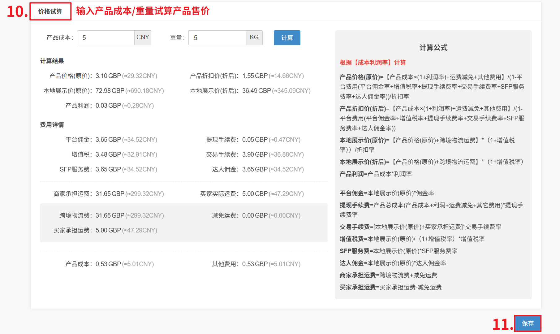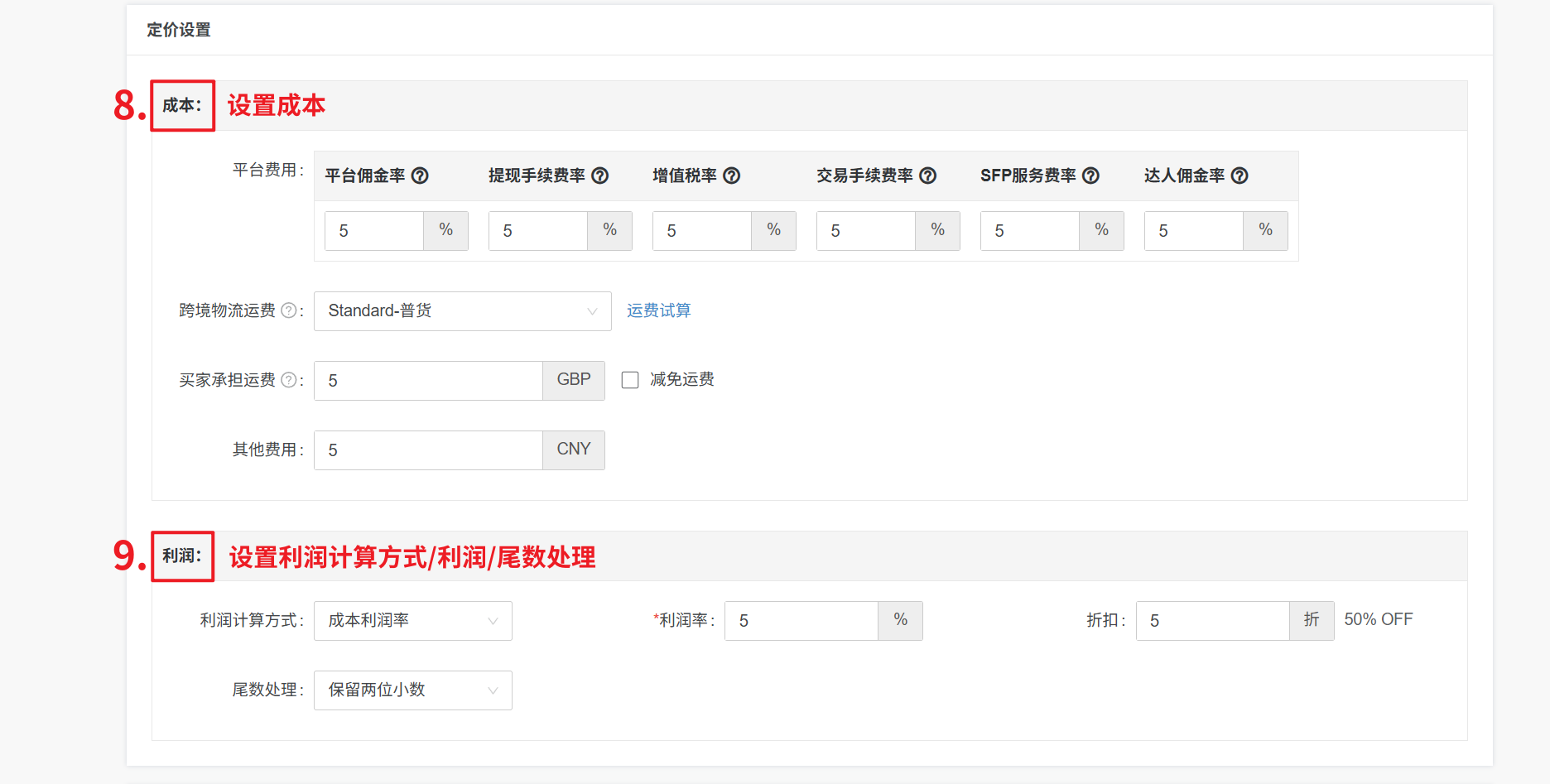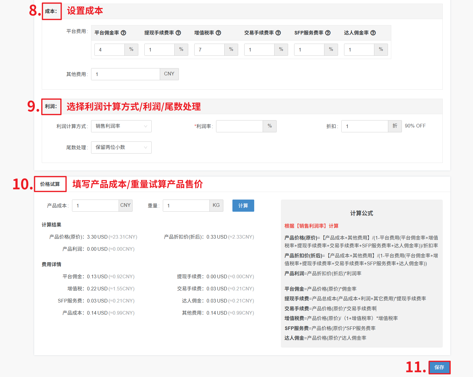 产品价格(原价)=【产品成本+运费减免+其他费用】/(1-平台费用(平台佣金率+增值税率+提现手续费率+
