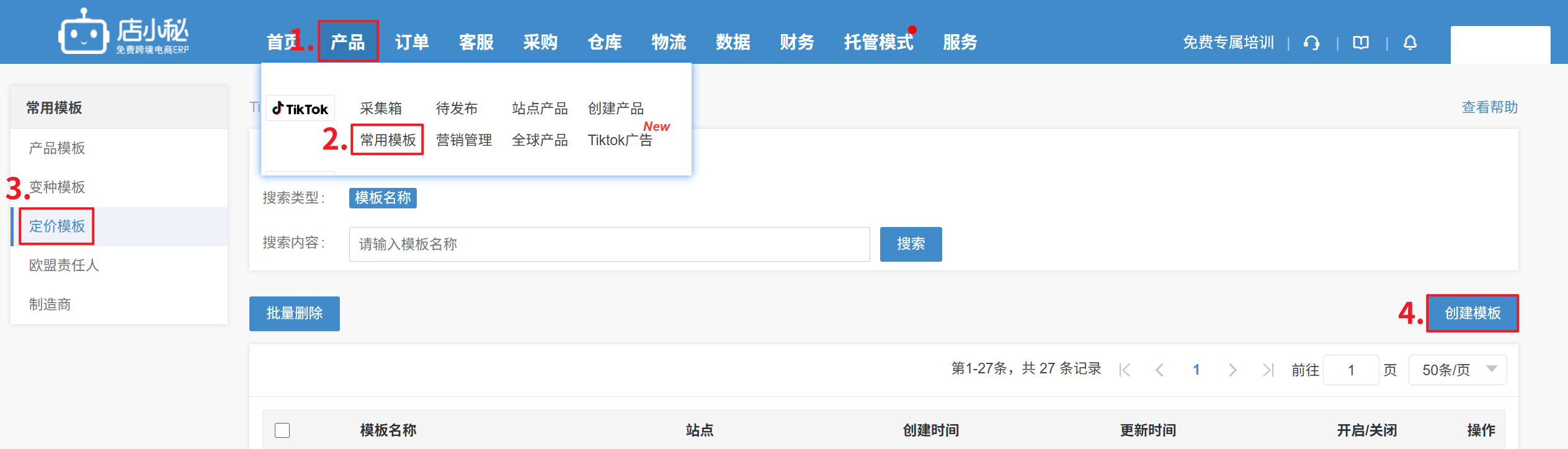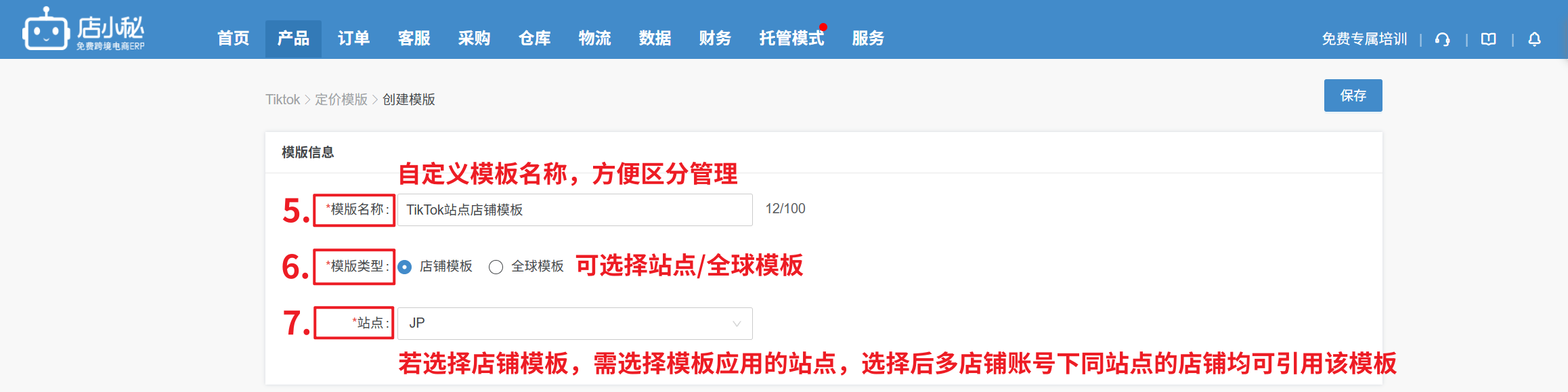 【产品—TikTok常用模板—定价模板—创建模板—自定义模板名称—选择站点/全球模板—选择站点—设置定价—保存】
