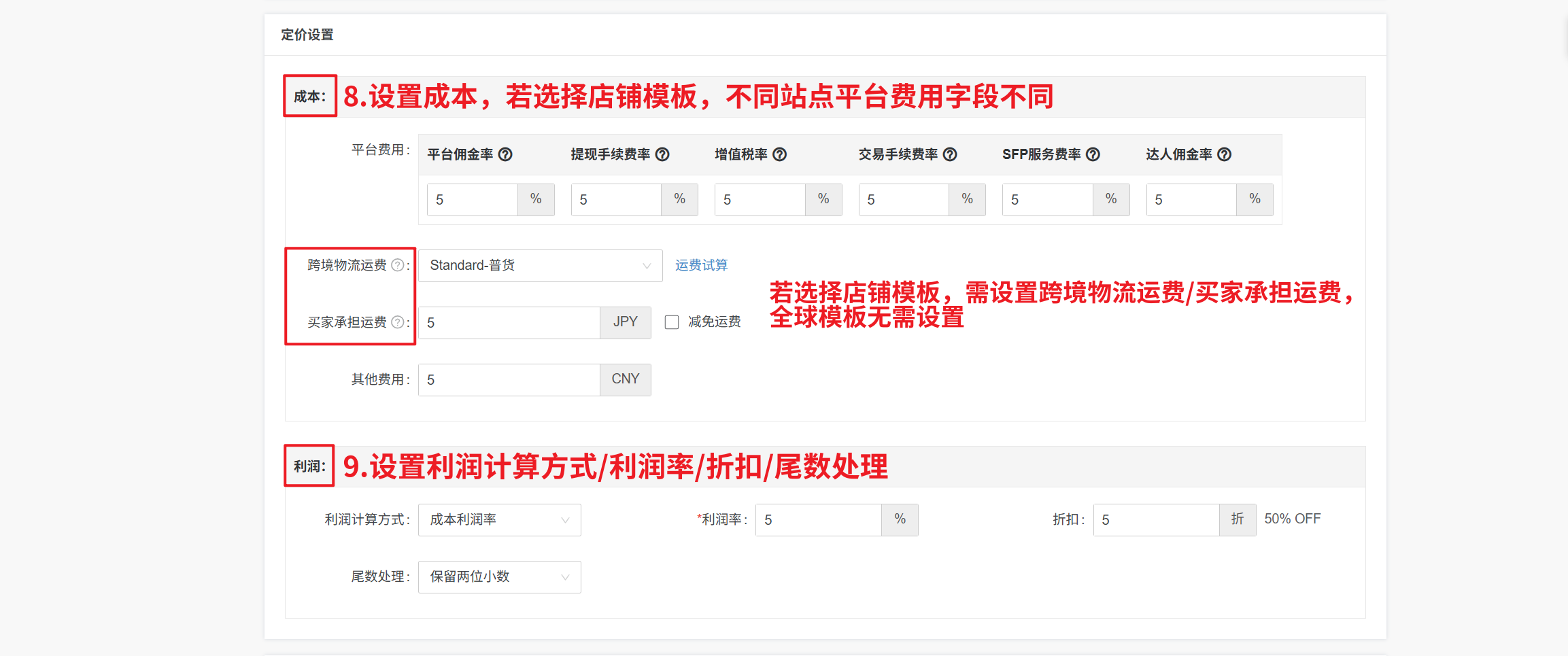 添加定价模板(设置成本,选择利润计算方式、设置利润率)