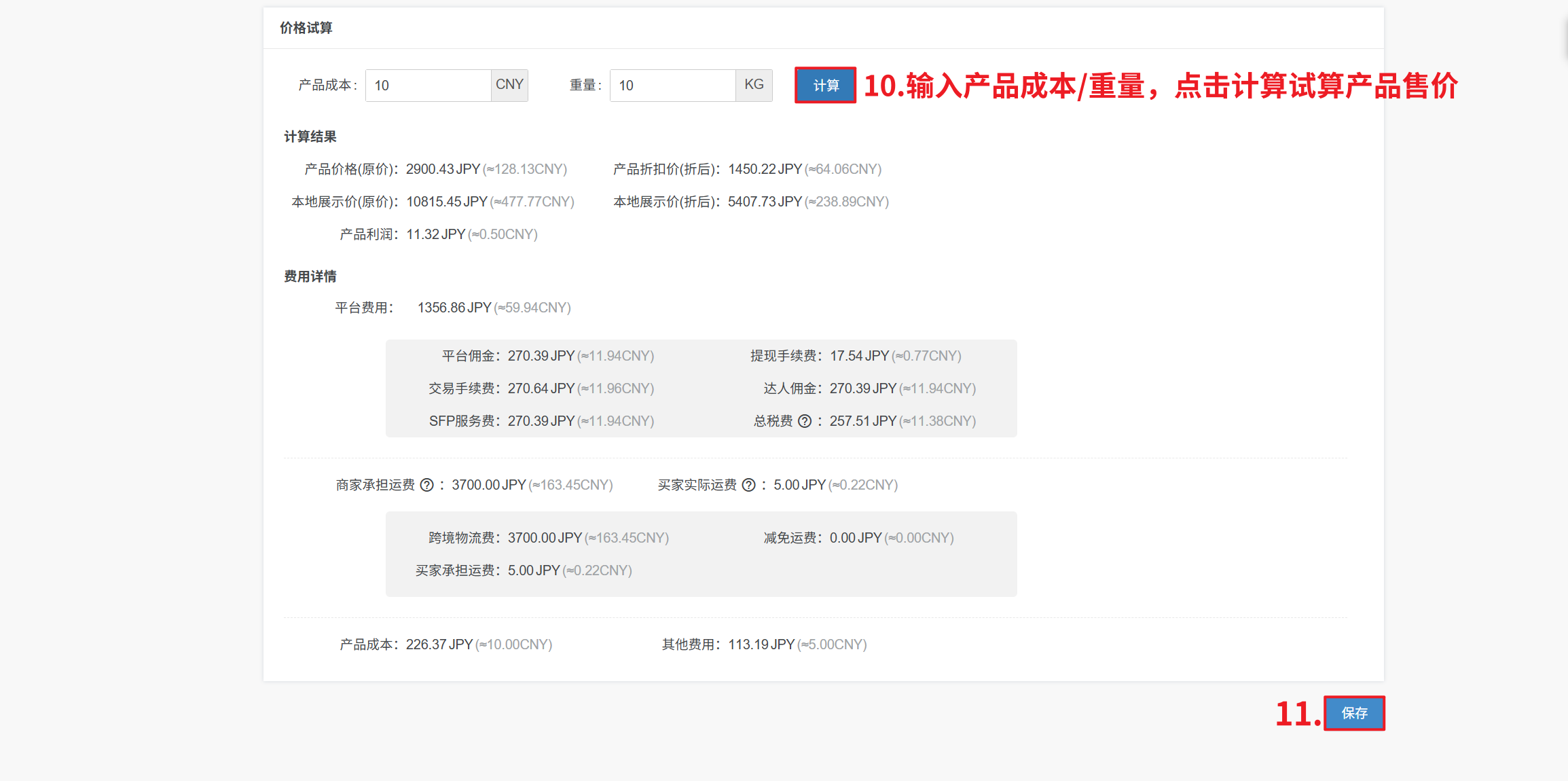 本地展示价(折后)=产品成本+产品利润+物流费用+运费减免+其它费用+平台费用