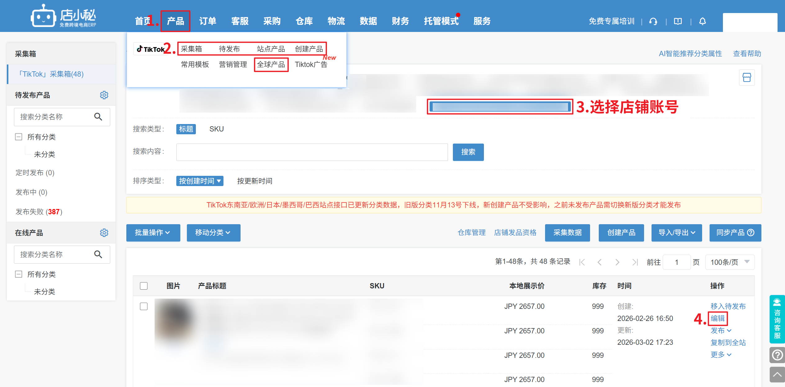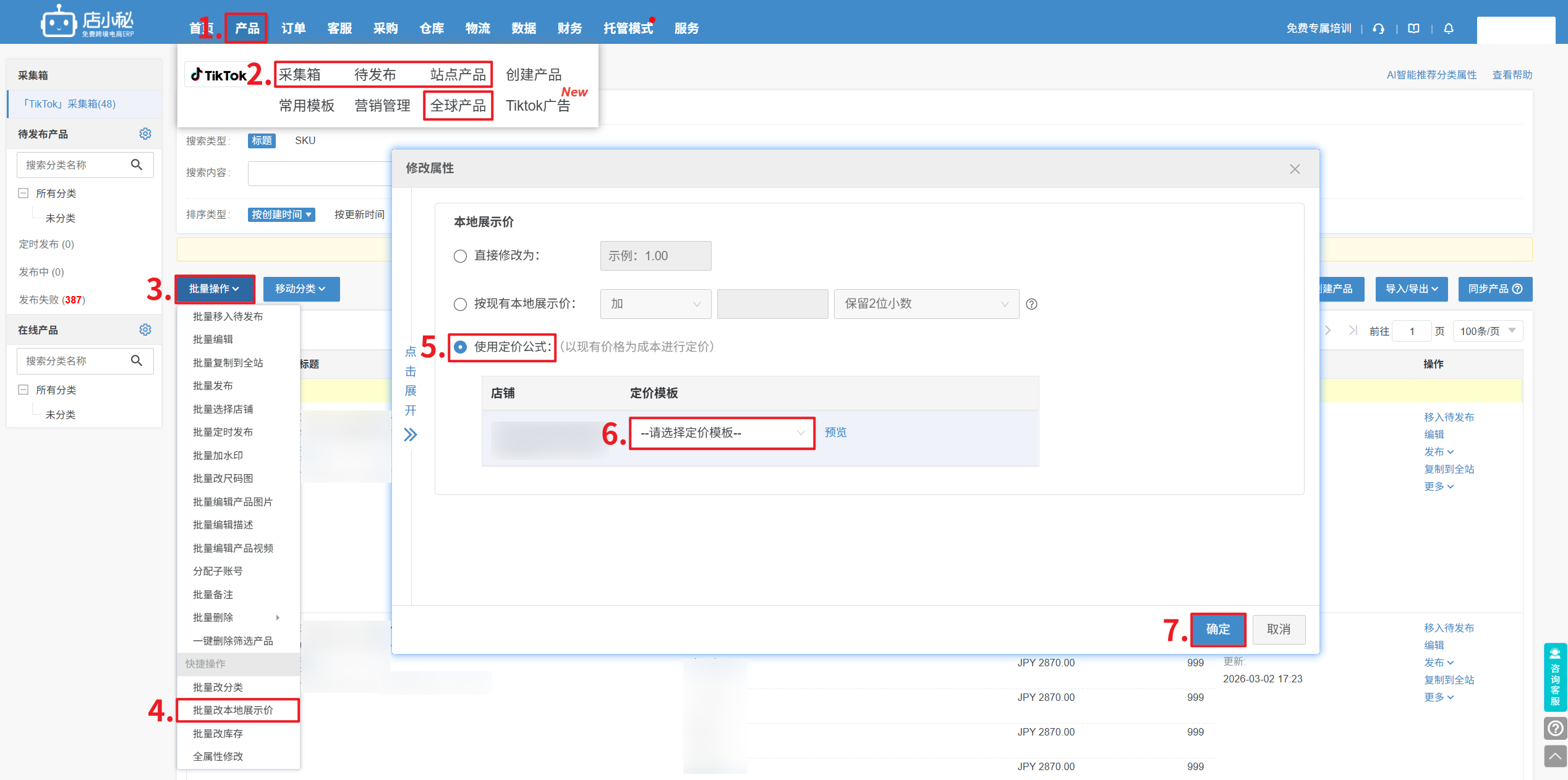【产品—采集箱/待发布/全球/站点/创建产品—选择店铺—编辑—本地展示价—批量—按定价模板修改本地展示价—选择定价模板—确定】