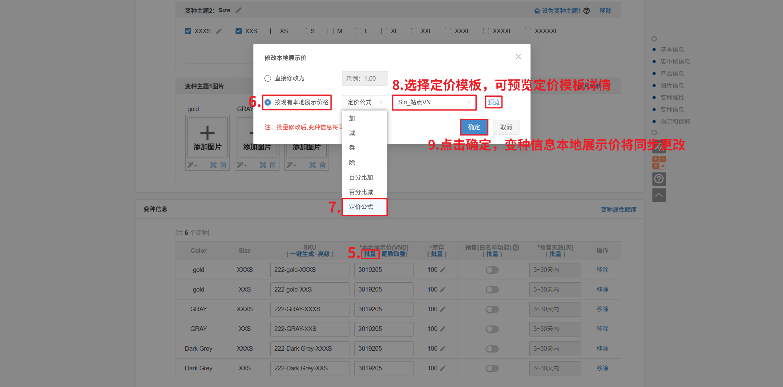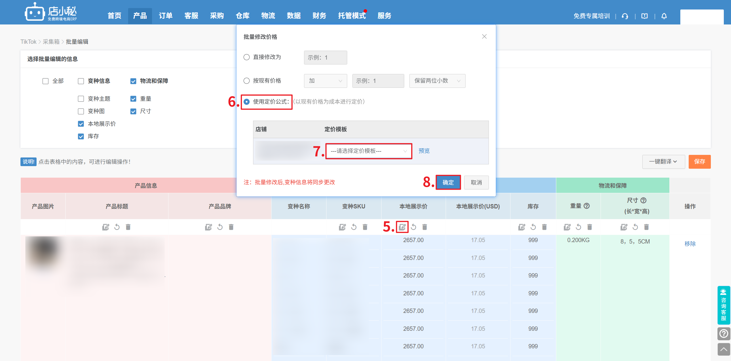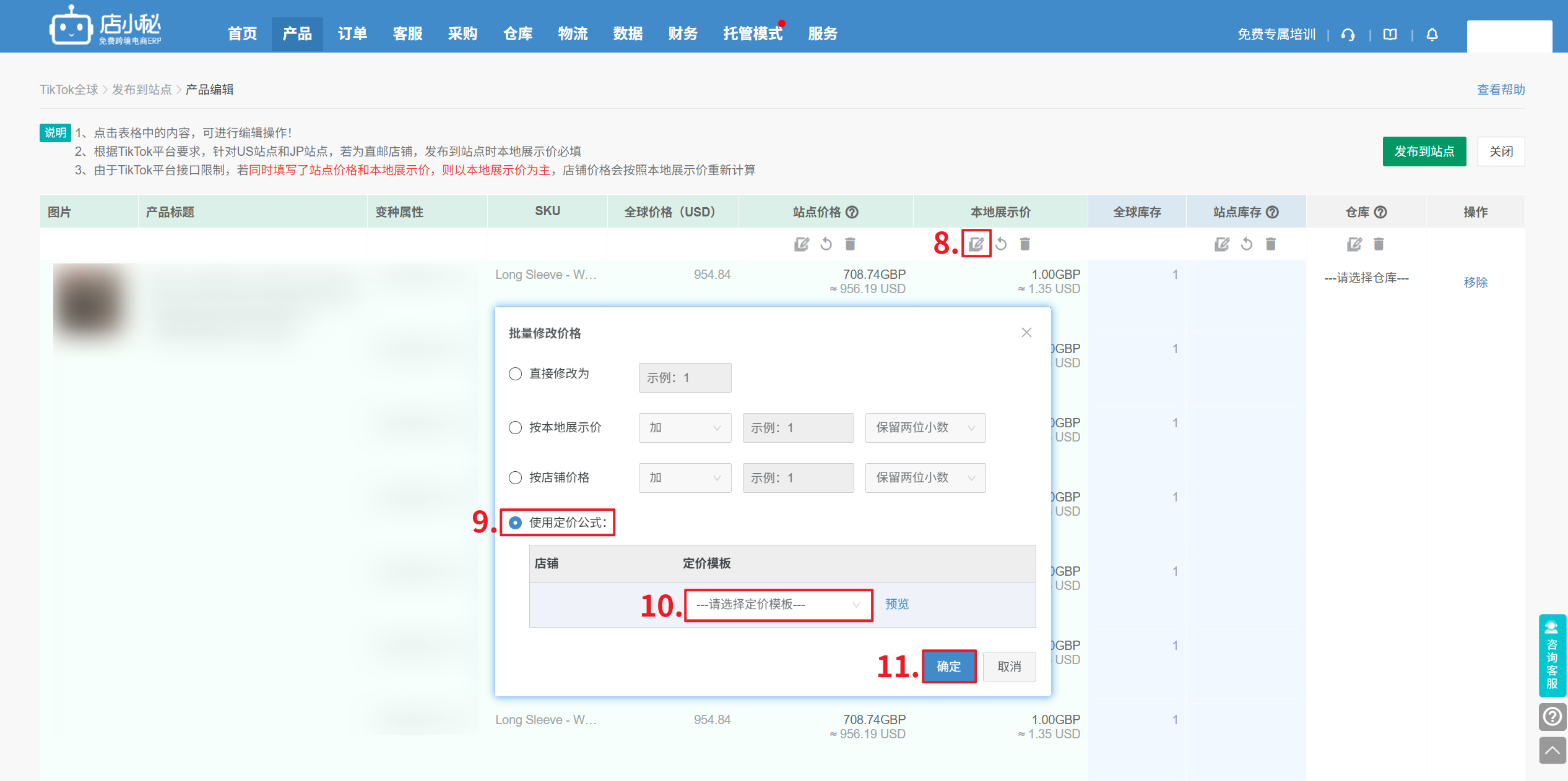 【产品—采集箱/待发布/全球/站点产品—批量编辑—本地展示价—点击小笔—选择使用定价公式—选择定价模板—确定】