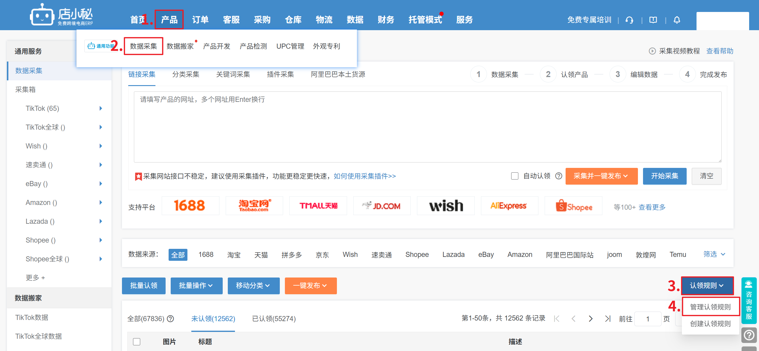 方式二:通用采集箱,认领规则,可设置按定价模板计算认领到全球/站点采集箱的本地展示价
