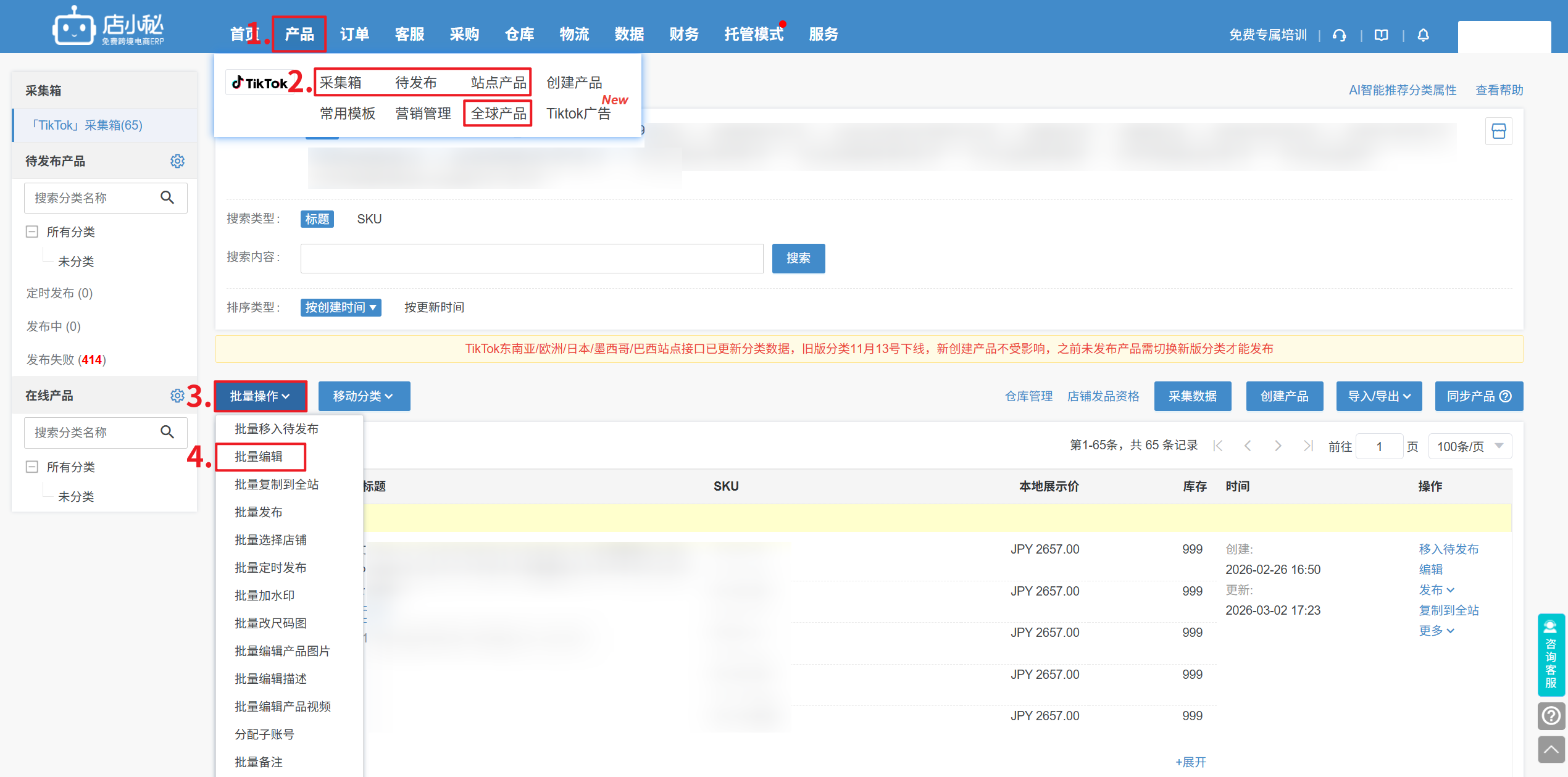 方式四:全球/站点产品列表页,批量编辑,可选择按定价模板修改本地展示价