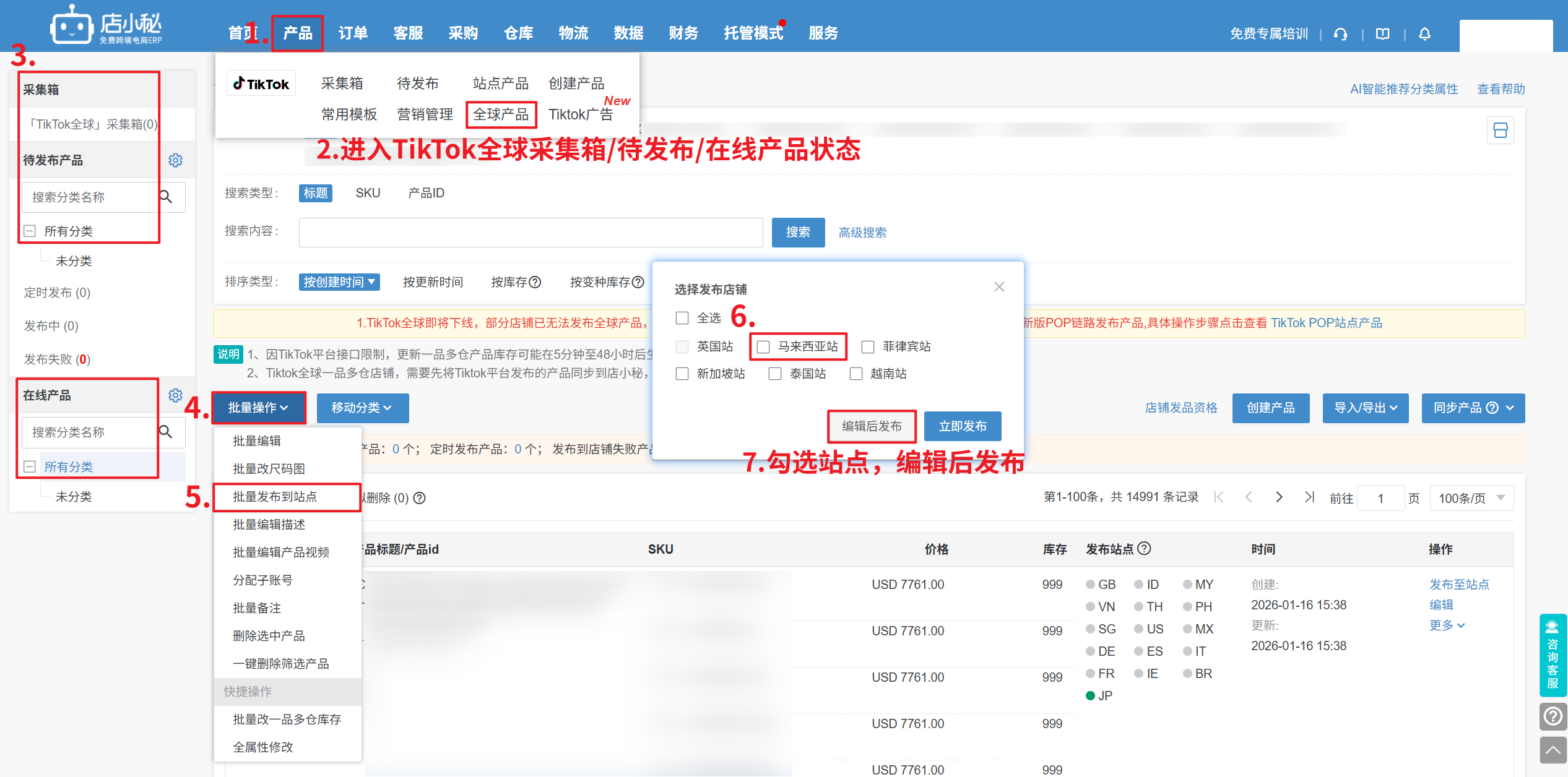 方式五:全球采集箱/待发布/在线产品批量操作批量发布到站点,可选择按定价模板修改本地展示价