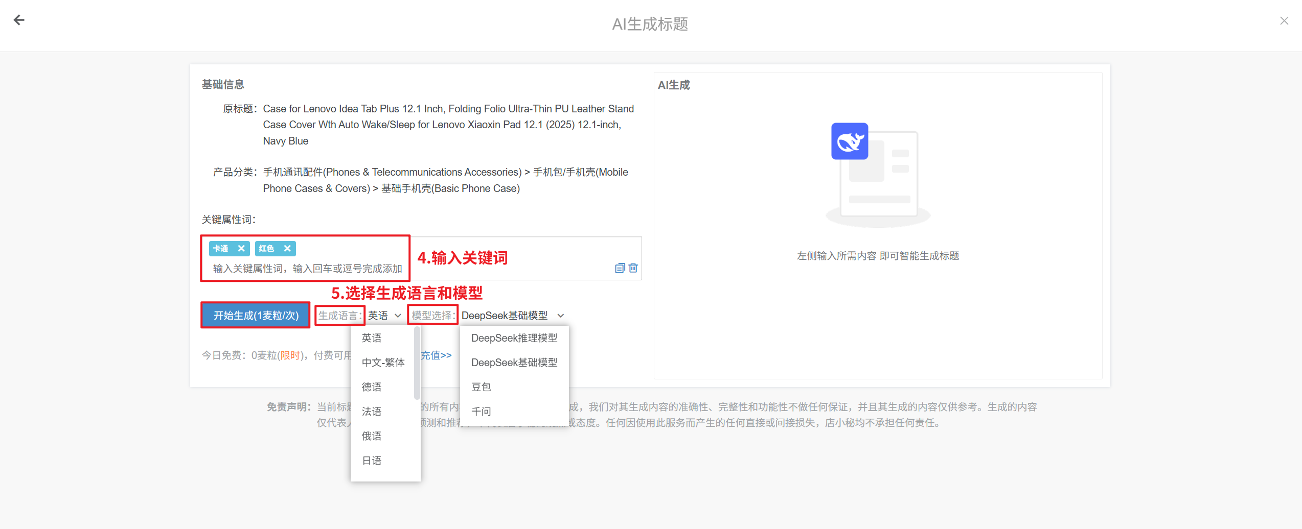 定义:输入关键词,可选择通过【DeepSeek推理模型】【DeepSeek基础模型】【豆包】【千问】智能生成标题/描述/五点描述