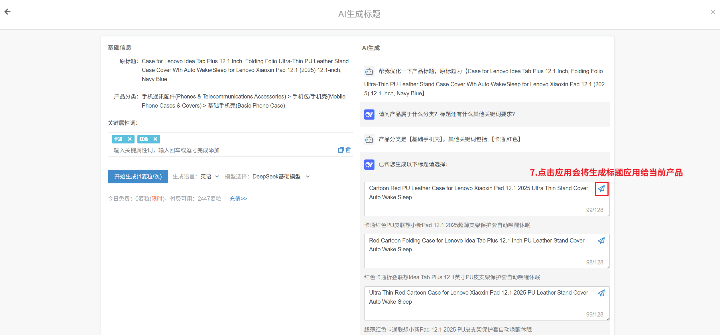 ② 若产品已经填写标签、品牌、属性等信息,生成标题/描述时,关键词可直接选择标签/属性