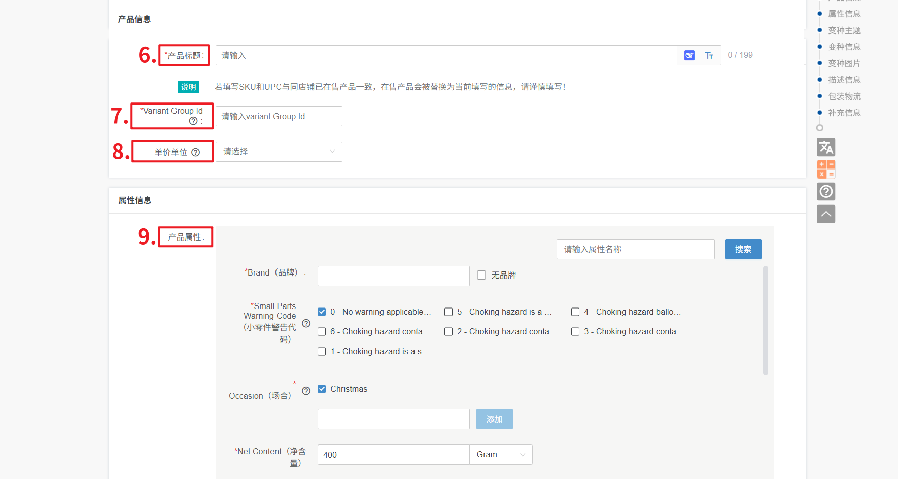 9、产品属性:带*为必填,其他选填
