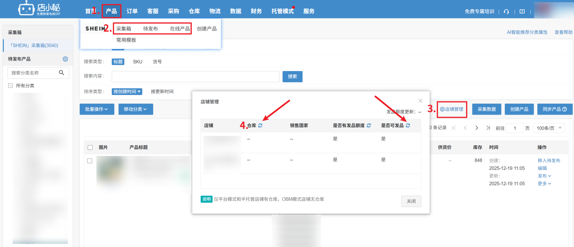 2、同一个店铺的话,到【采集箱/待发布/在线产品—店铺管理】同步下仓库和发品资格后再发布