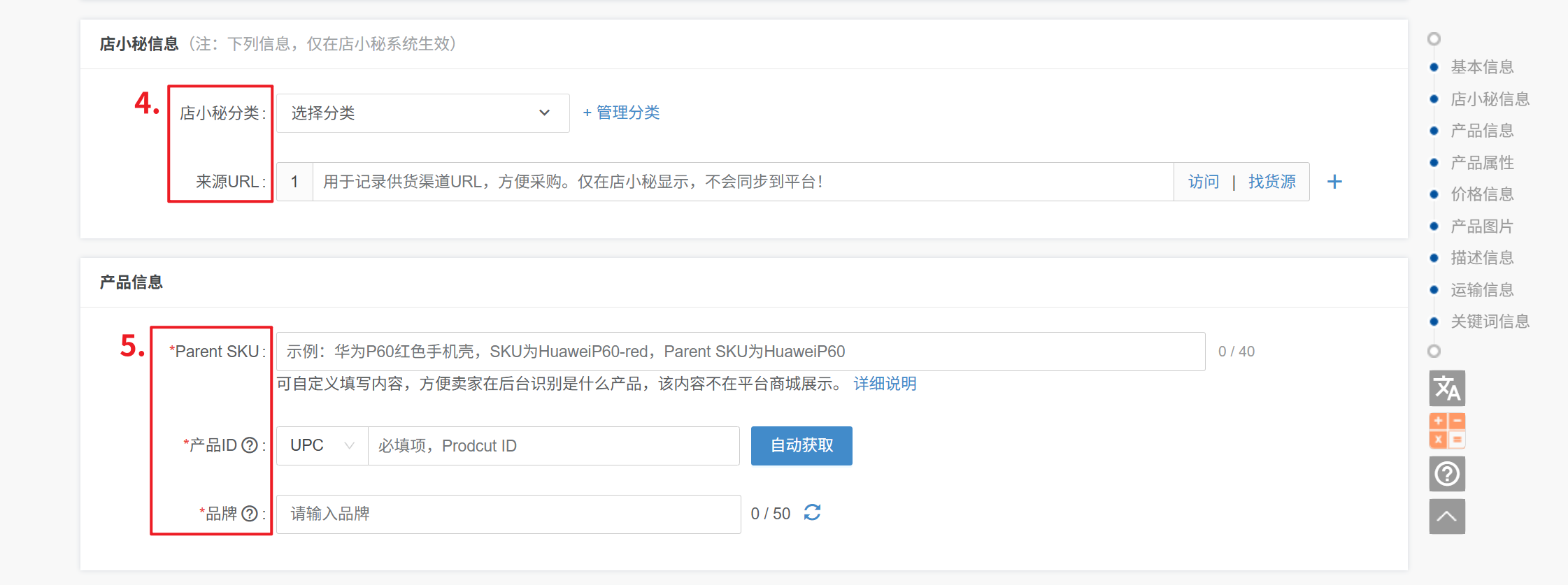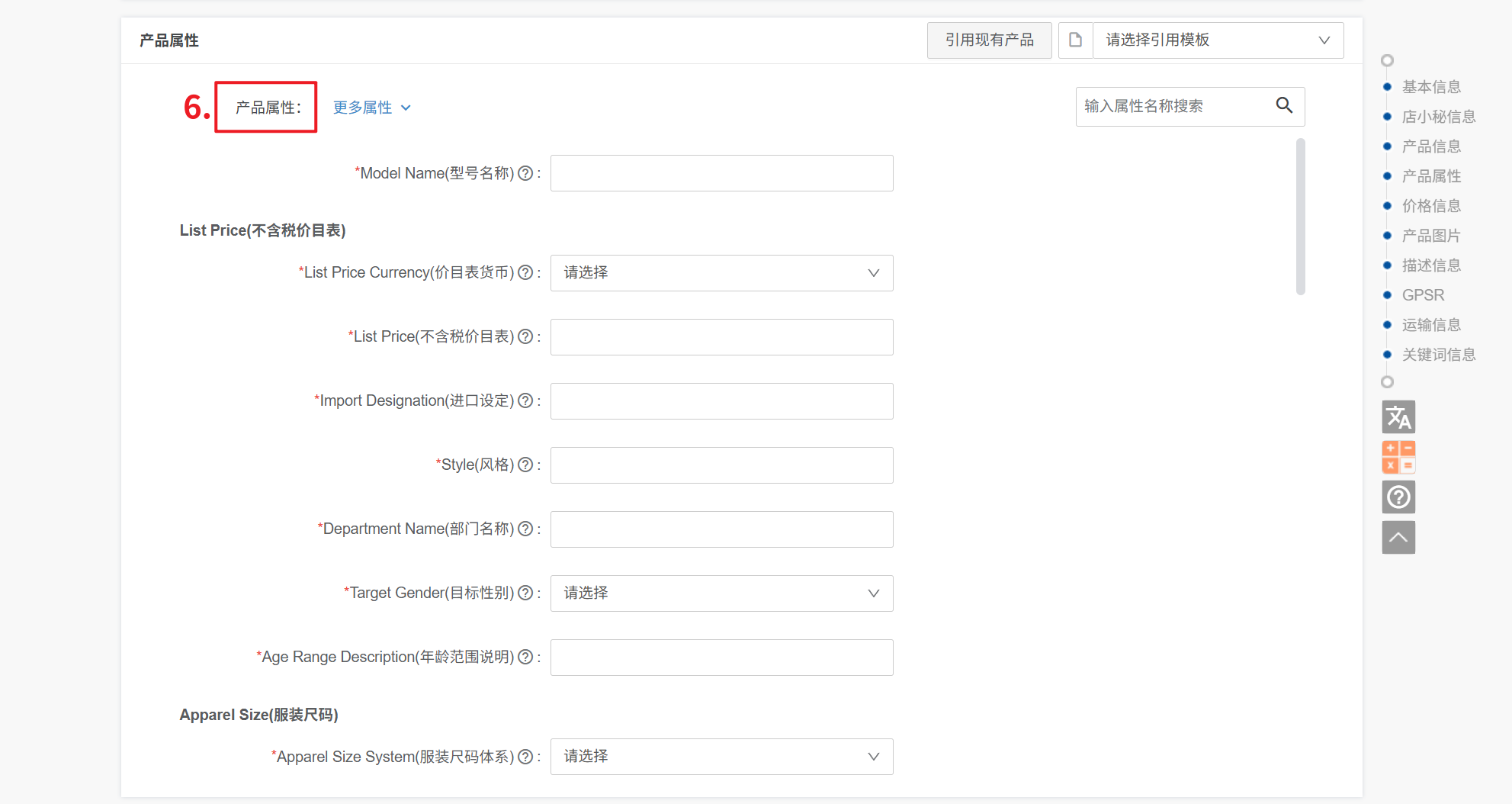 6、产品属性:带*必填,鼠标放在问号可参考字段说明,建议根据售卖产品实际填写