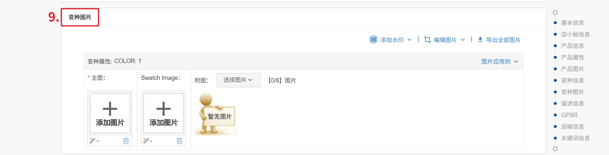8、变种主题:产品变种以什么维度区分的,例如产品是有多个颜色,就可以选择变种属性为Color