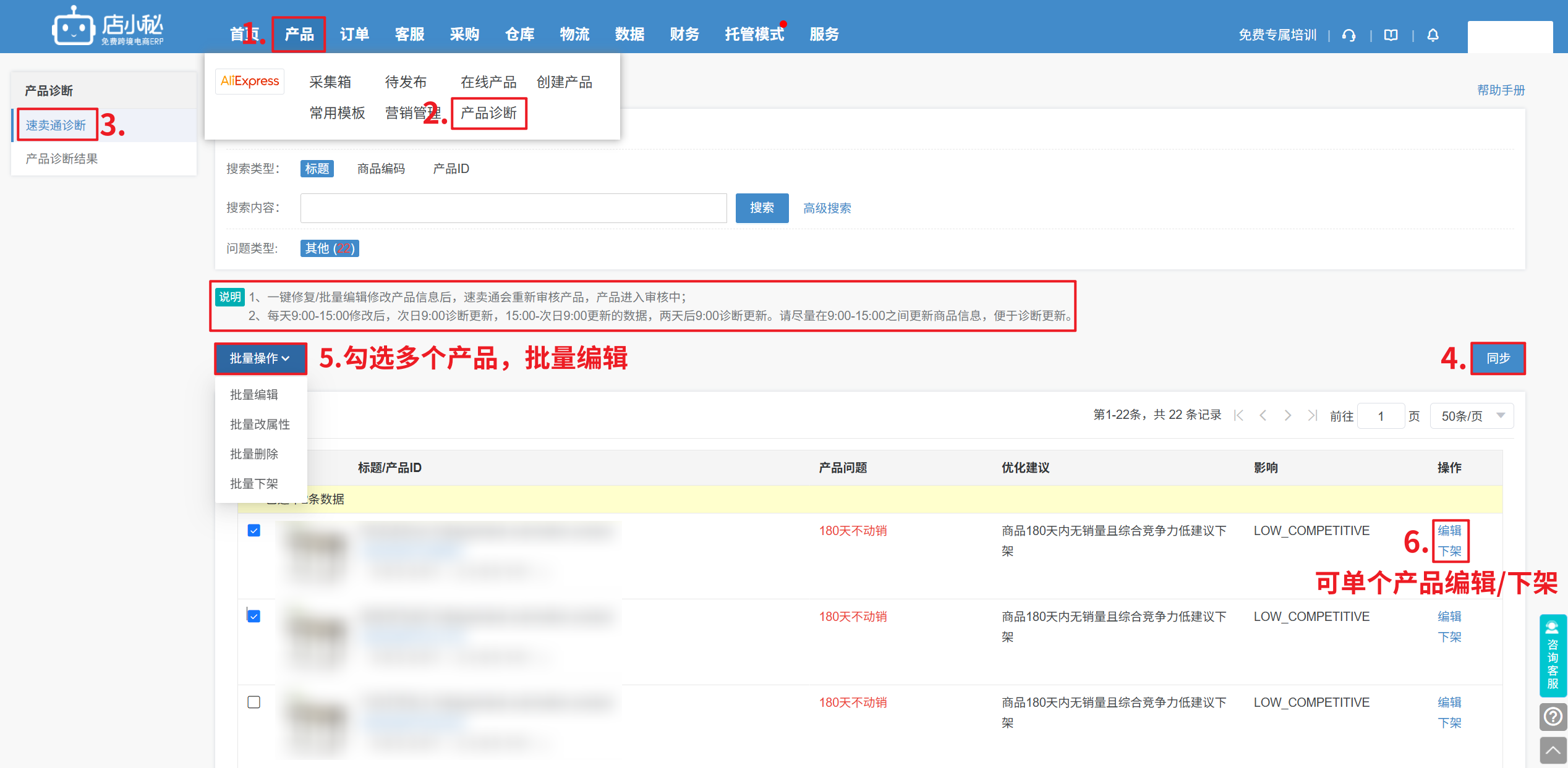 小秘每天9点过后也会自动同步一次诊断结果,也可以手动同步,速卖通后台诊断结果不出现这个产品,小秘就不会出现