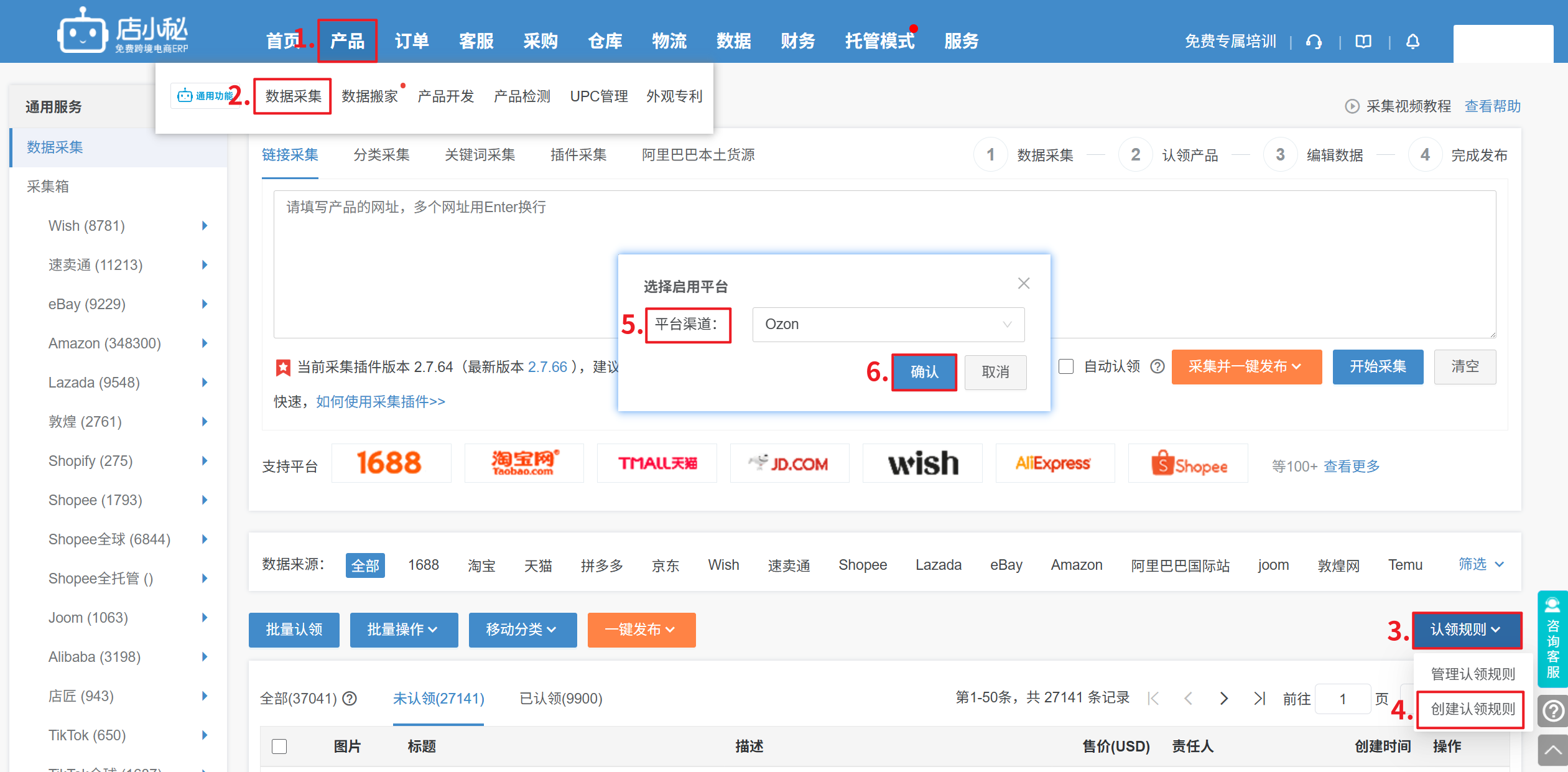 第一步:【产品—数据采集—认领规则—创建认领规则—选择Ozon—确定】