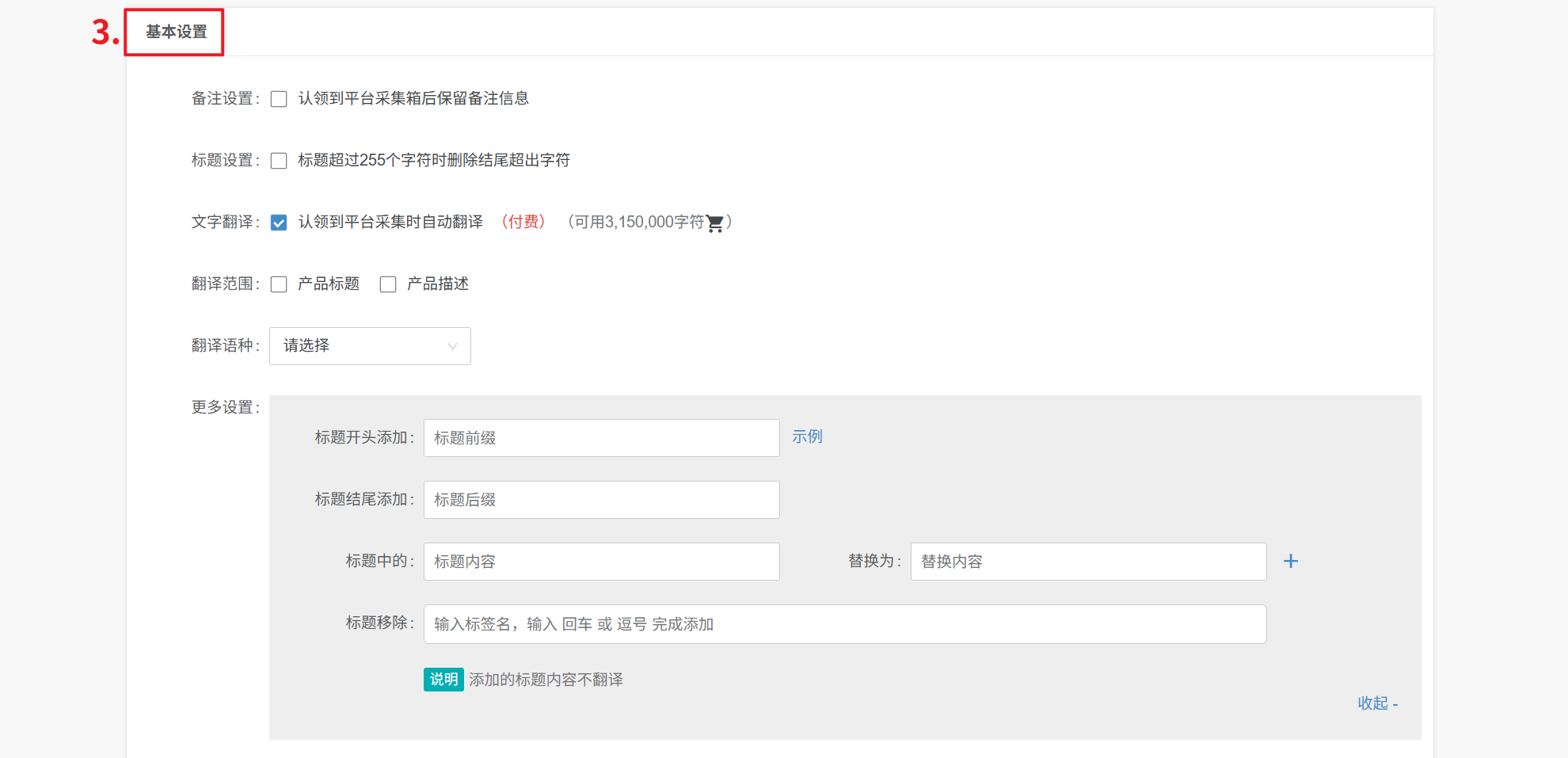 更多设置:① 可针对标题开头/结尾、添加固定词