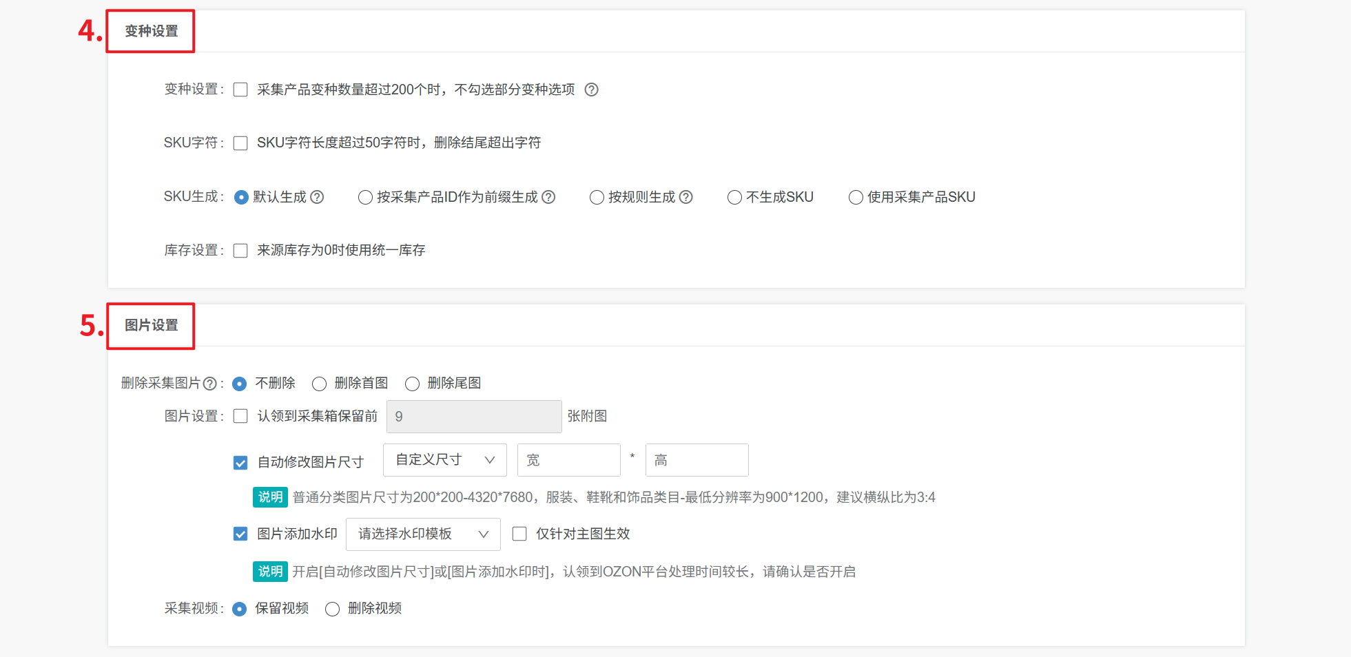 注意:开启自动修改图片尺寸或图片添加水印时,认领到OZON平台处理时间较长,请确认是否开启