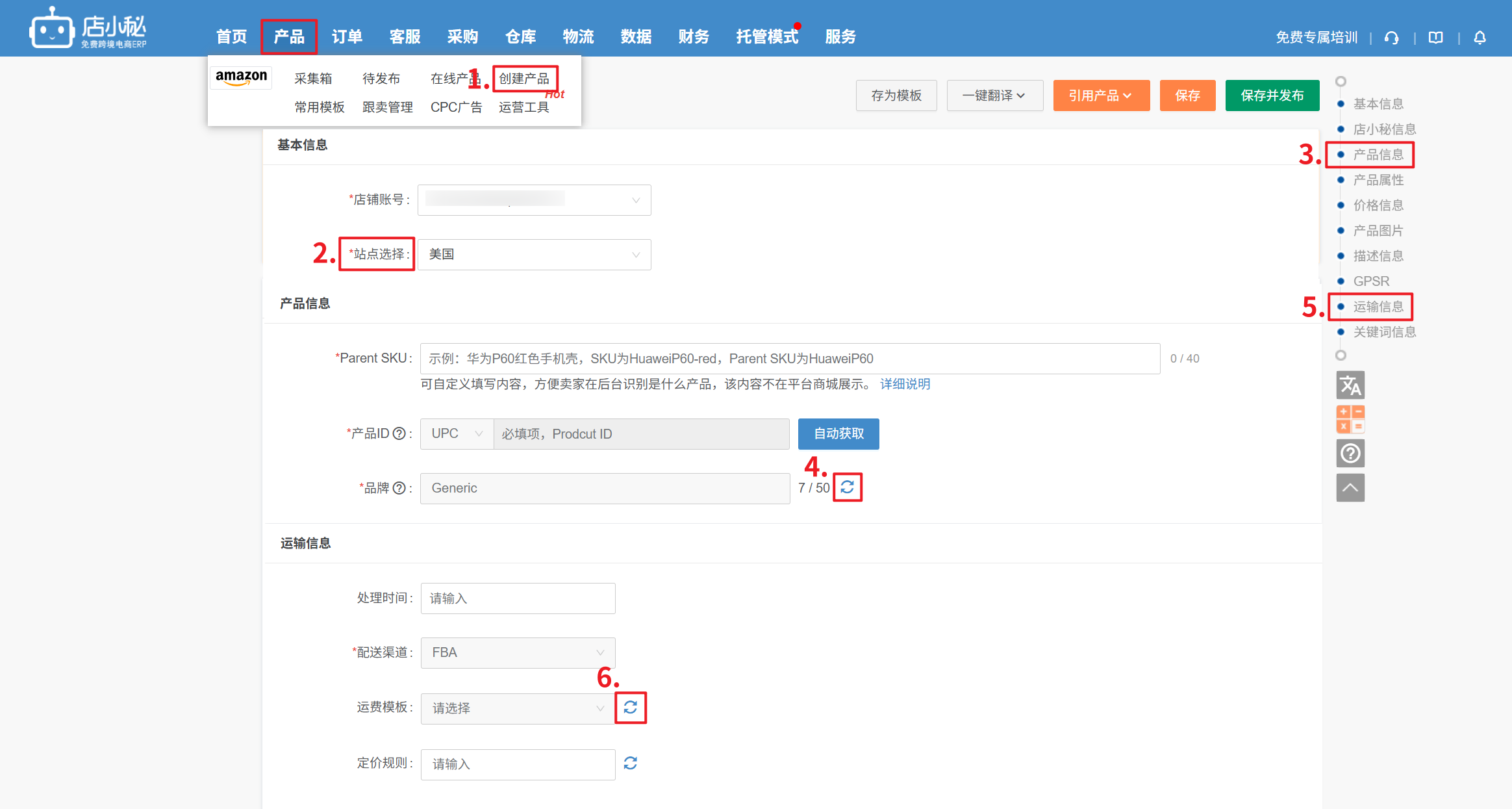 【产品—Amazon—创建产品—选择美国站—选择低价产品—无需填写品牌/UPC/物流方式—完善其它产品信息—保存并发布】