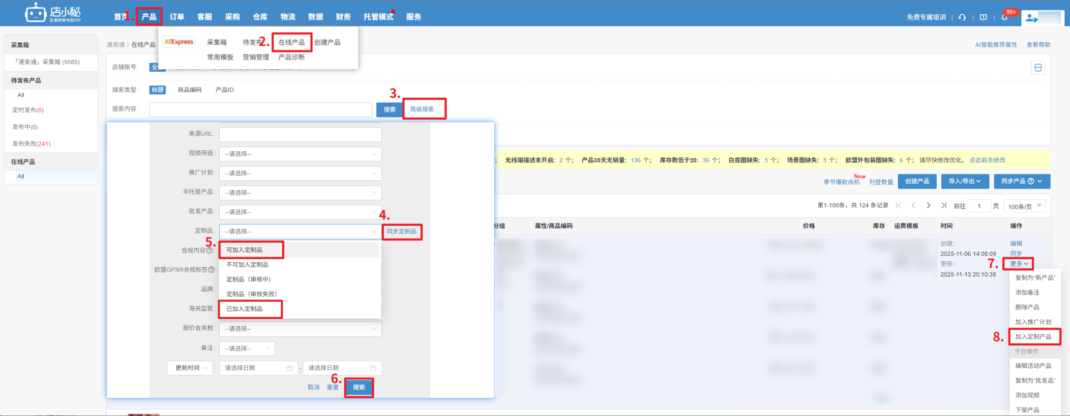 第一步:【产品—速卖通—在线产品—高级搜索—同步定制品—筛选可加入/已加入定制品—搜索—点击更多—加入/编辑定制产品】