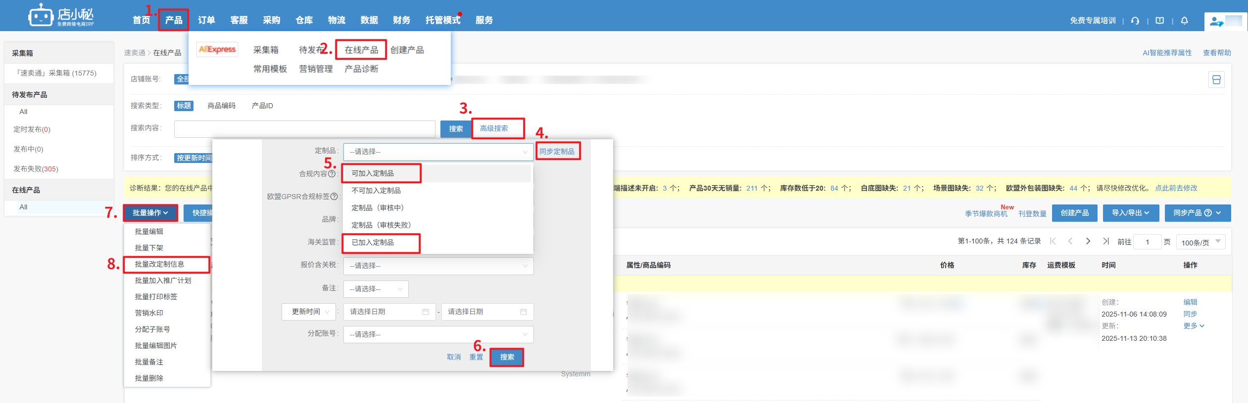 第一步:【产品—速卖通—在线产品—高级搜索—同步定制品—筛选可加入/已加入定制品—搜索—点击批量操作—批量改定制信息】