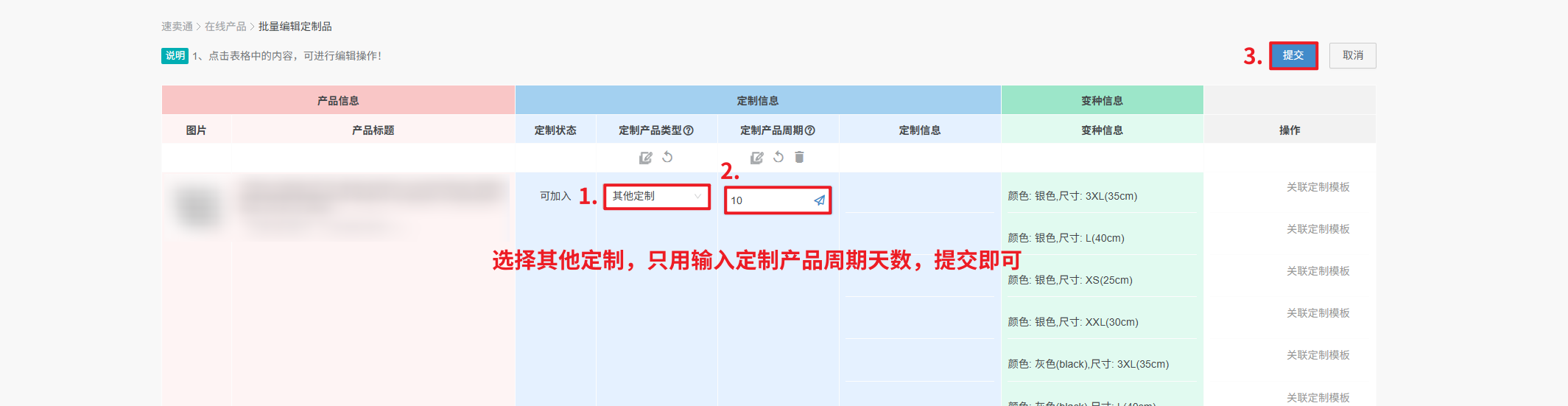 1、标准定制:输入定制产品周期,可以关联速卖通定制模板(不同SKU分别设置)