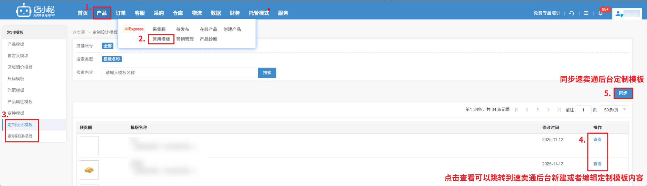 点击【管理定制模板】支持在店小秘【速卖通产品—常用模板】下,同步和查看全部速卖通定制模板信息