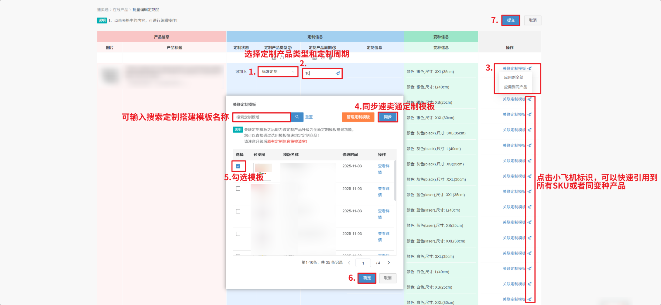 第二步:【选择定制产品类型和产品周期—单个/批量关联定制模板—同步速卖通定制模板—勾选模板—确定—点击提交】