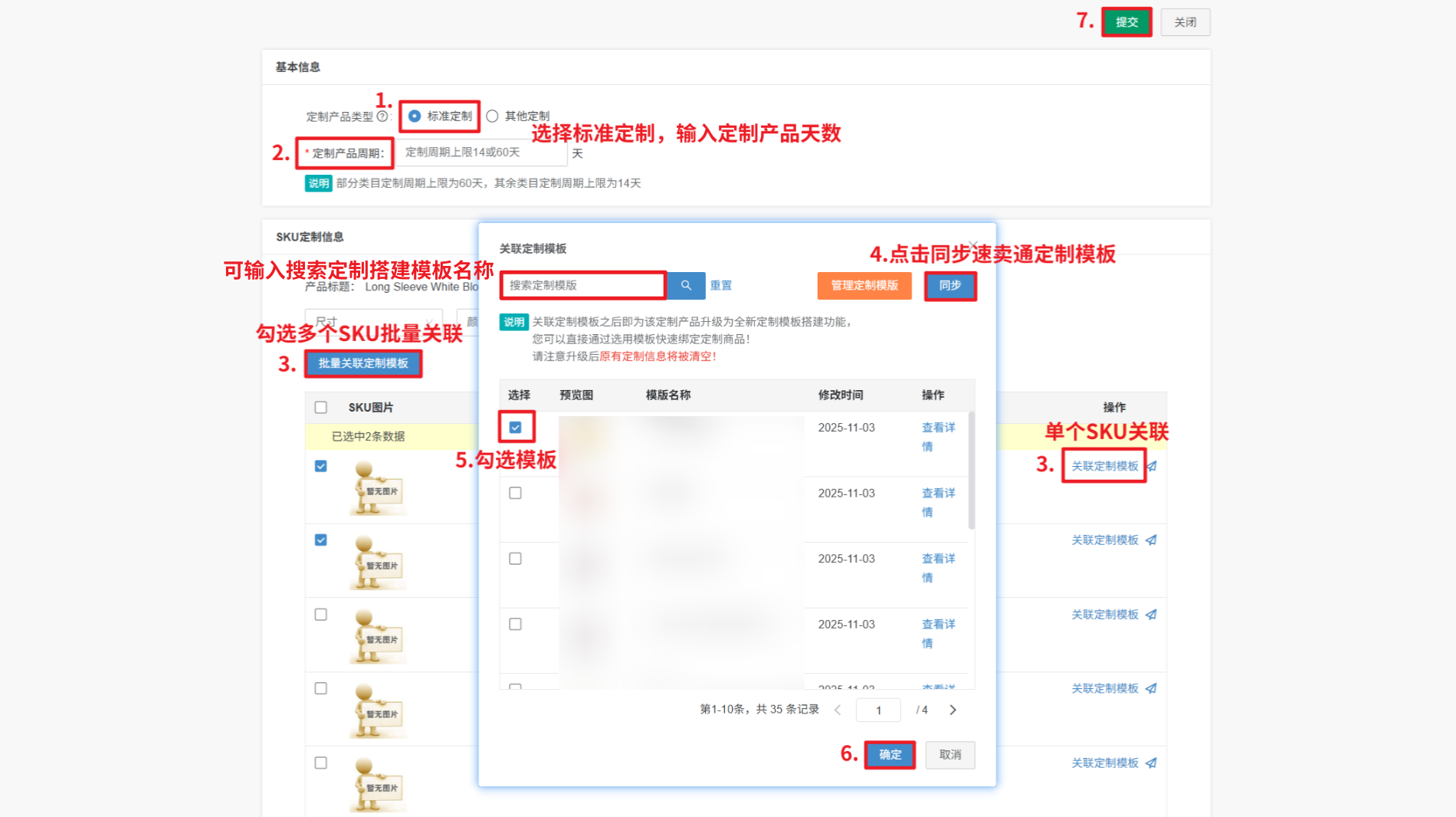 第二步:【选择定制产品类型和产品周期—关联定制模板—同步速卖通定制模板—勾选模板—确定—点击提交】
