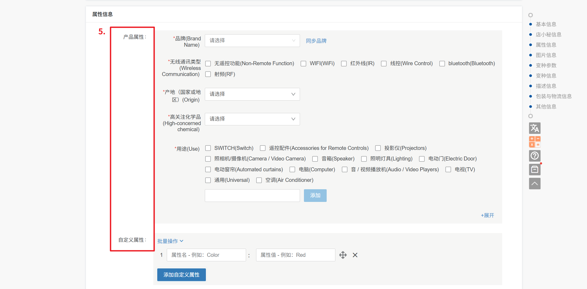 ① 产品属性:不同的产品分类,产品属性不一样,根据实际产品选择即可,带*号必填