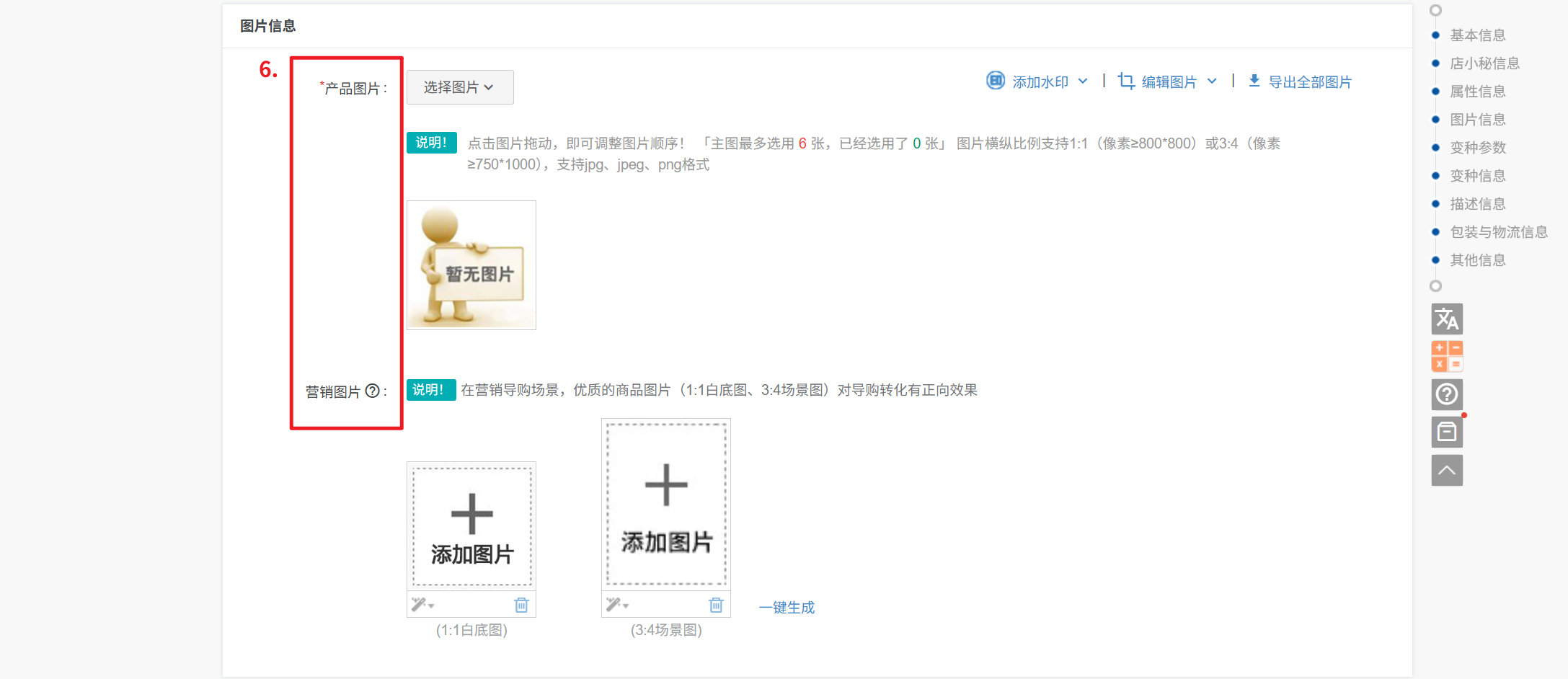 注意:1、主图最多上传6张、图片比例支持1:1(像素≥800*800)或3:4(像素≥750*1000),支持jpg、jpeg、png格式,带*号必填
