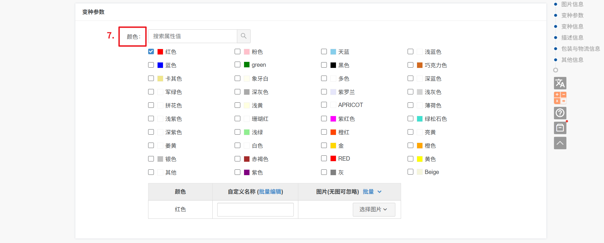 注意:1、如果没有对应颜色,可任意勾选颜色后,输入自定义名称(速卖通本土前台会展示自定义名称)