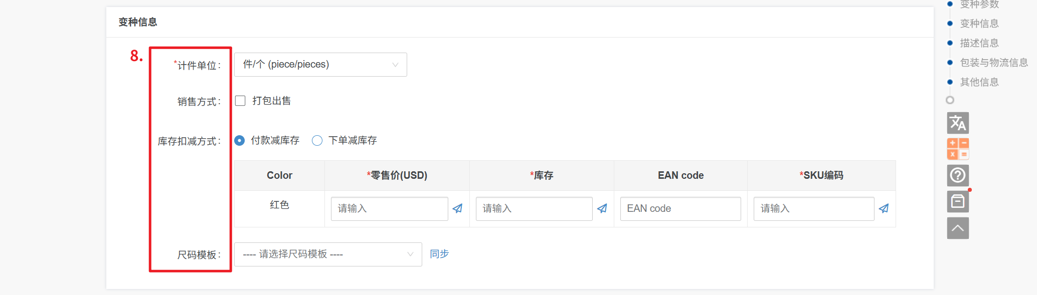 7、变种参数:勾选颜色、尺寸等变种规格,不同的产品分类,变种主题展示会不一样,根据产品实际情况勾选,带*号必填