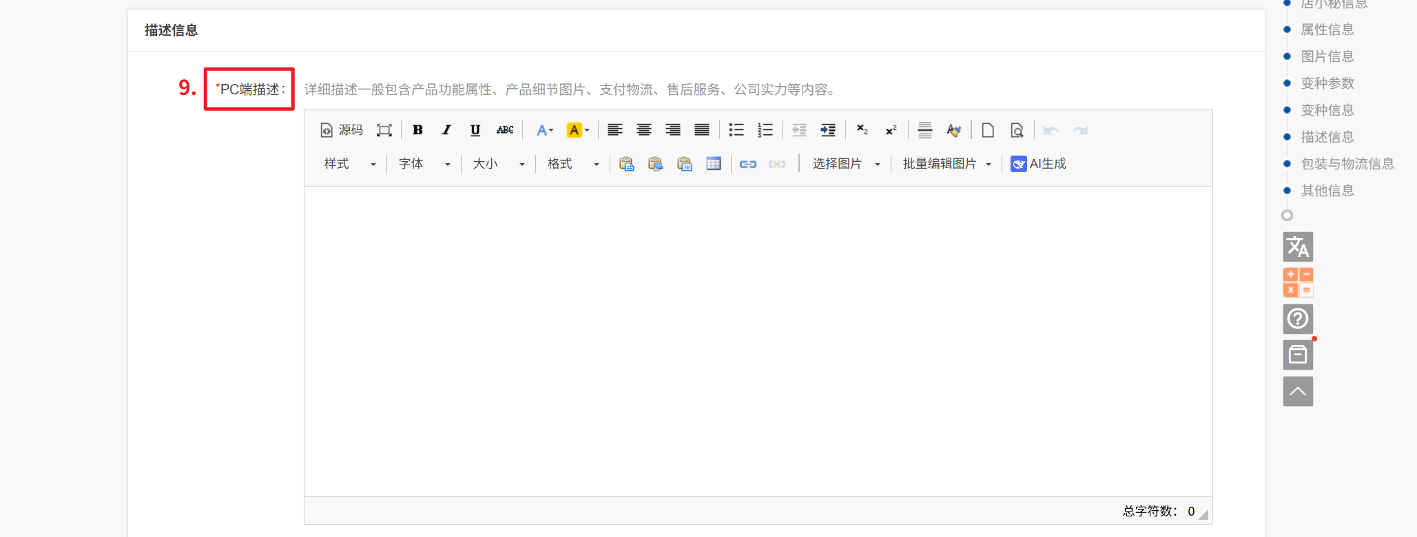 9、描述信息:详细描述一般包含产品功能属性、产品细节图片、支付物流、售后服务、公司实力等内容,支持上传文字图片等信息