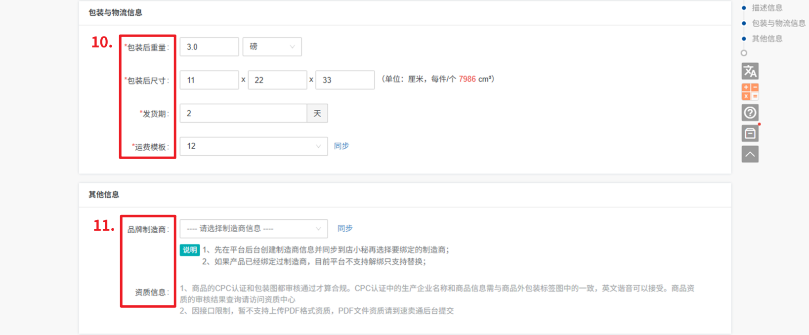 ② 包装后的尺寸:填写产品打包后的尺寸,单位为厘米,每件/个0cm³,支持小数点后两位,带*号必填