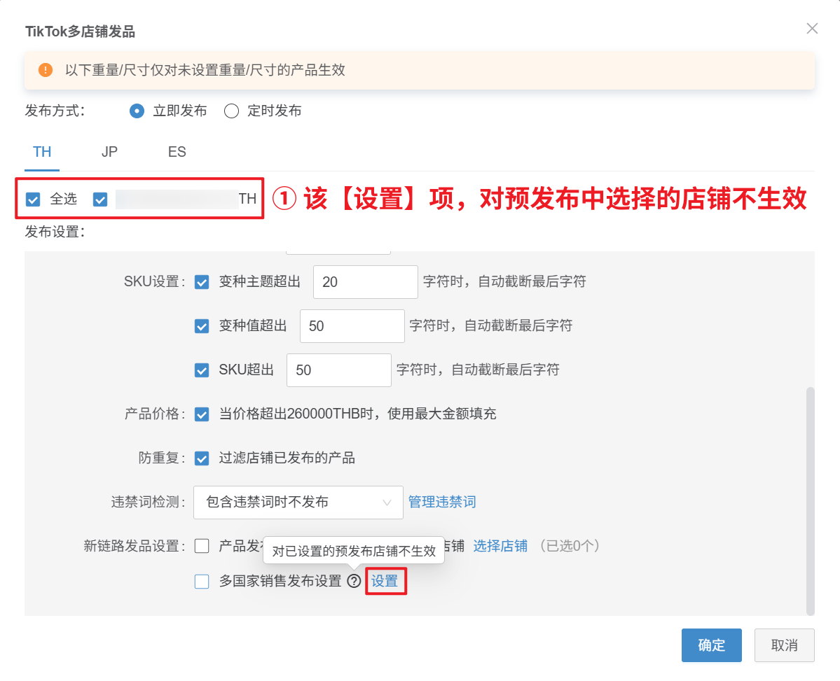 注意:① 该【设置】项,对预发布中选择的店铺不生效