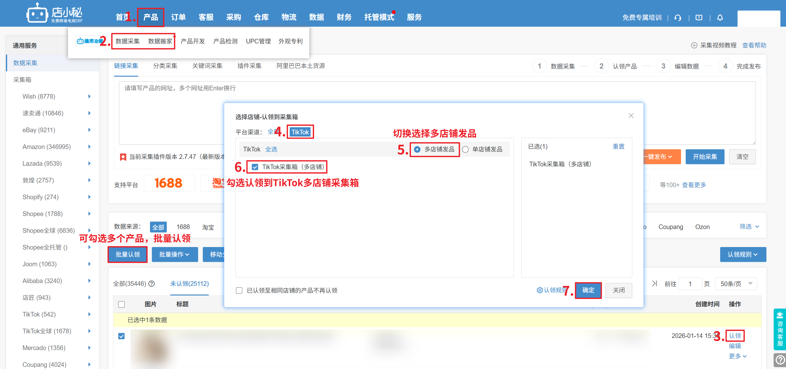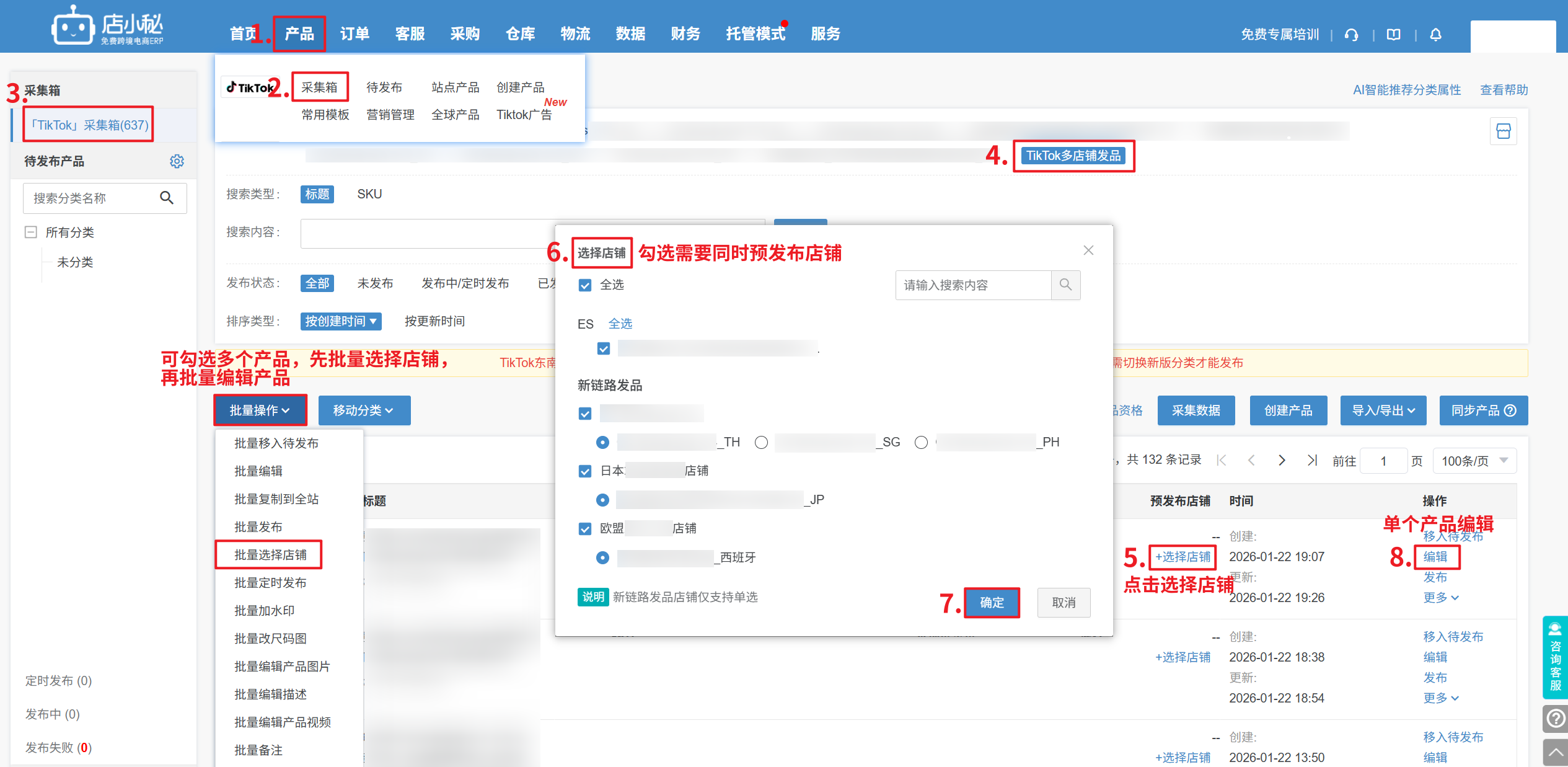 第二步:【产品—TikTok站点产品—采集箱—单个/批量选择预发布店铺—勾选店铺—点击确定—单个/批量编辑产品信息】