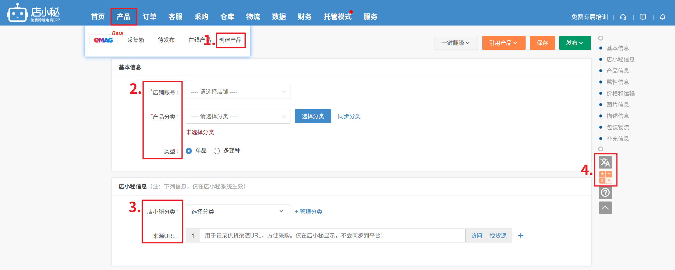 ① 数据采集: 将其它电商平台站点的产品信息一键采集到店小秘
