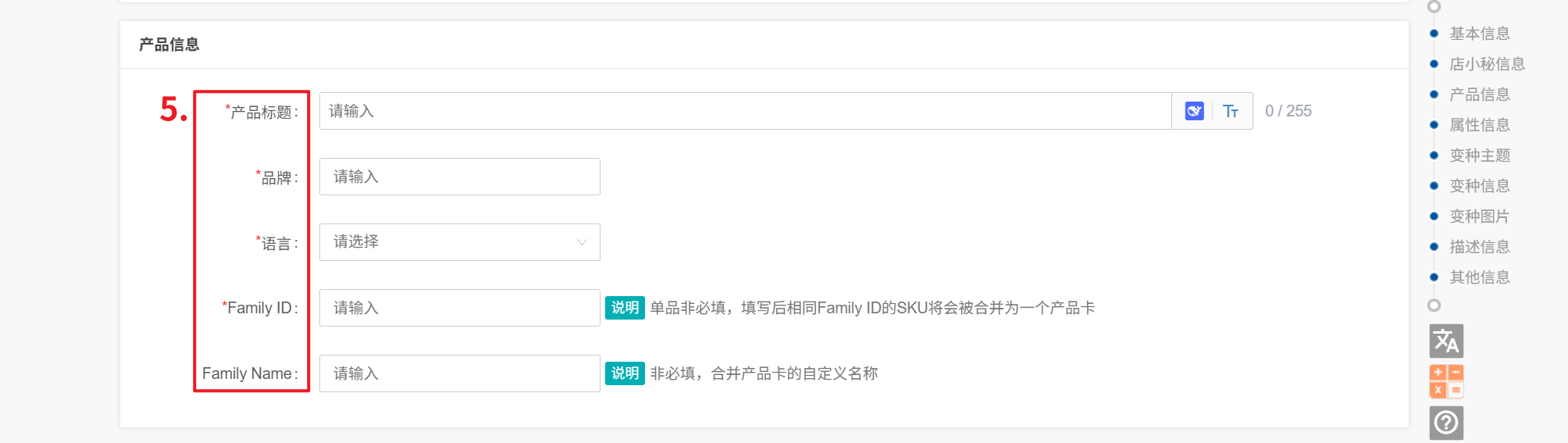 ① 产品ID:不同变种SKU产品ID不能重复,自定义填写,仅支持填写数字,字符不能超出9个