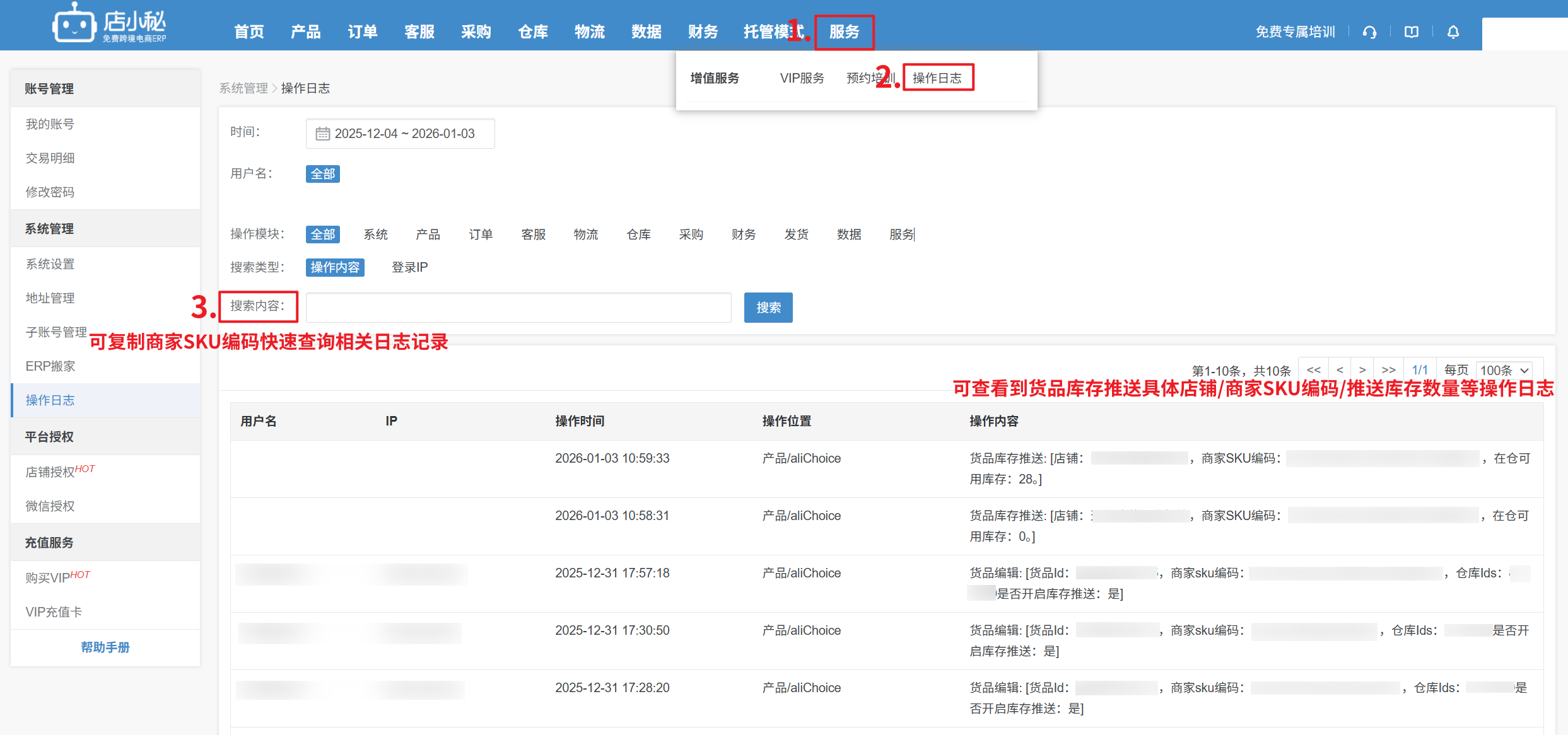 第四步:设置后可以到【服务—操作日志】查看货品库存推送记录