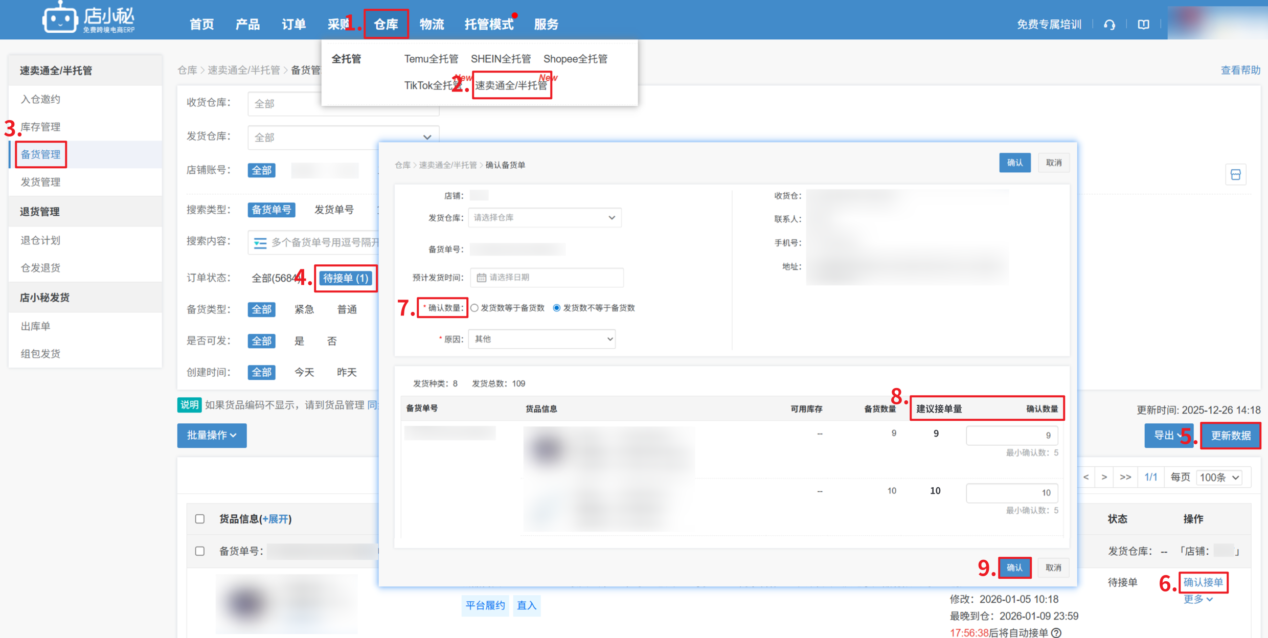 【仓库—速卖通全/半托管—备货管理—更新数据—确认接单】
