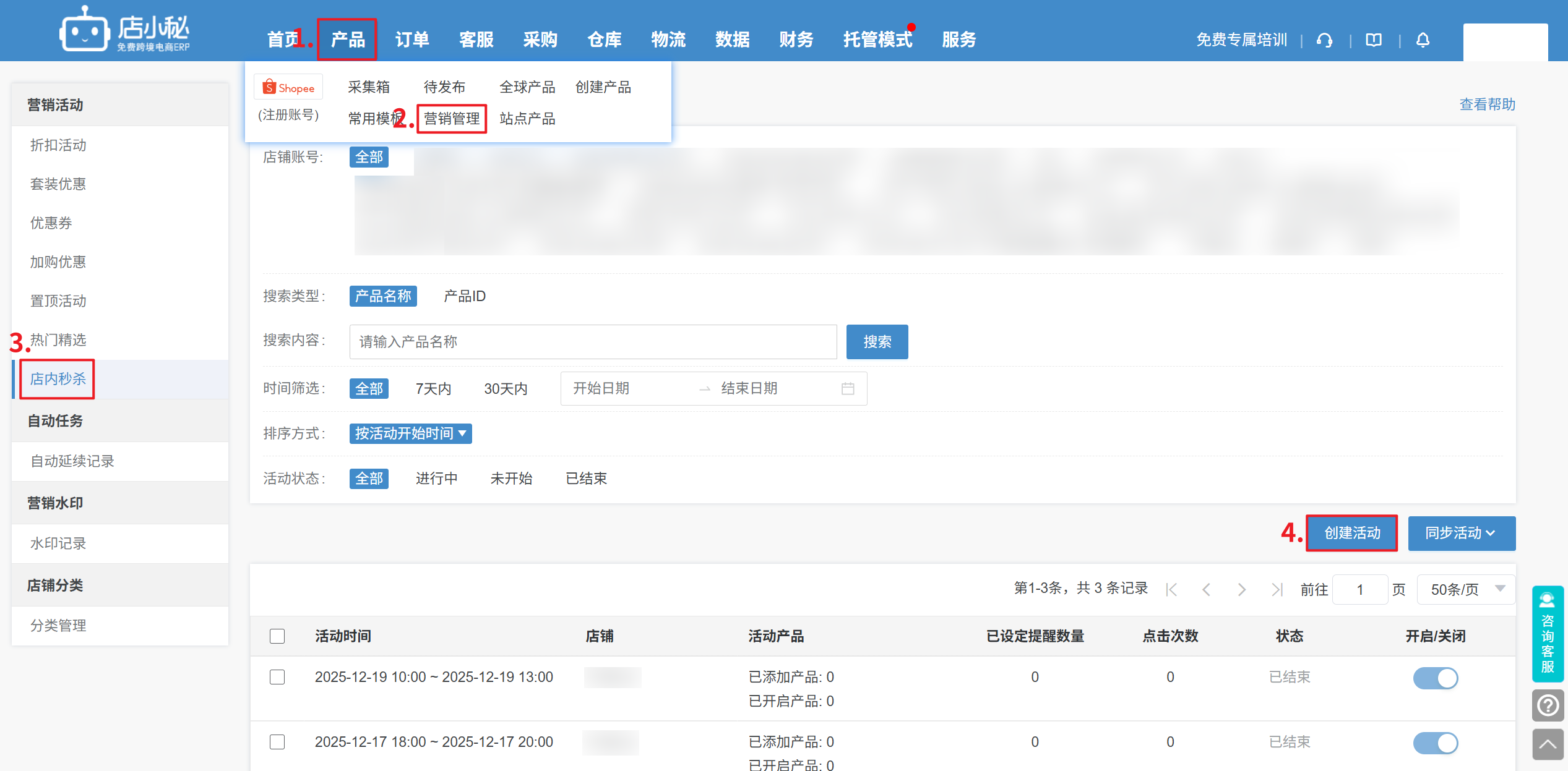 第一步:【产品—Shopee营销管理—店内秒杀—创建活动】