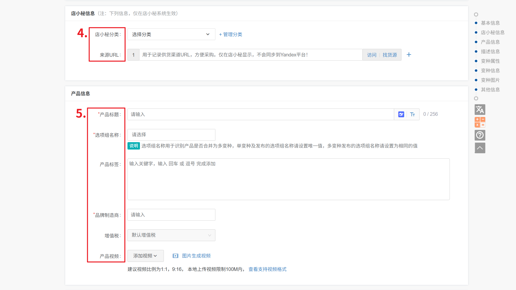 ⑥ 产品视频:1、建议视频比例为1:1,9:16, 本地上传视频限制100M内,视频格式为MP4