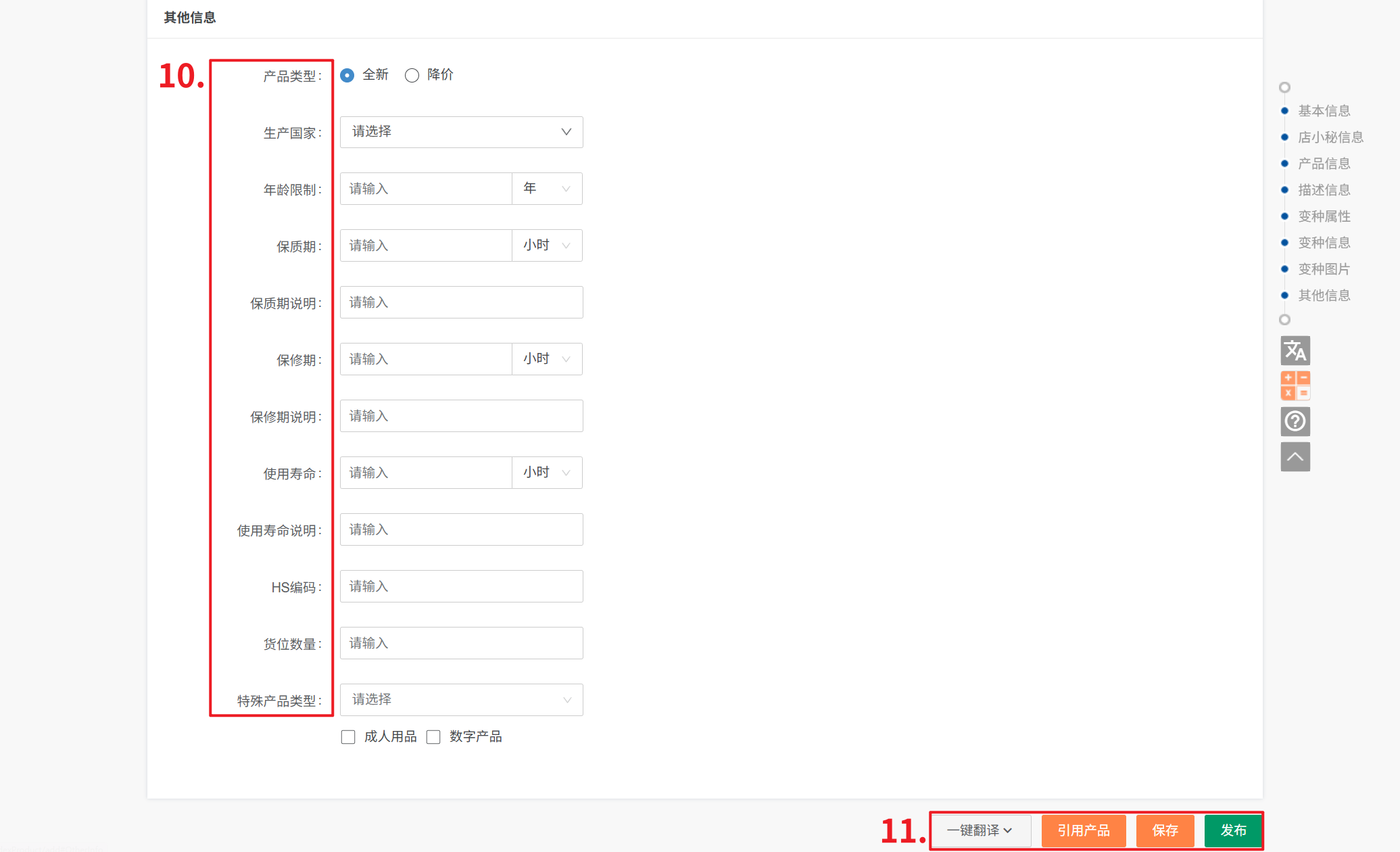 ⑨ 特殊产品类型:选择产品特殊类型,是否成人用品、数字产品