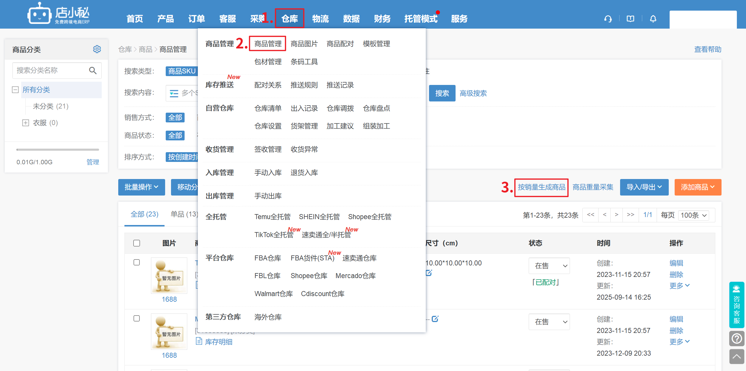 第一步:【仓库—商品管理—按销量生成商品】