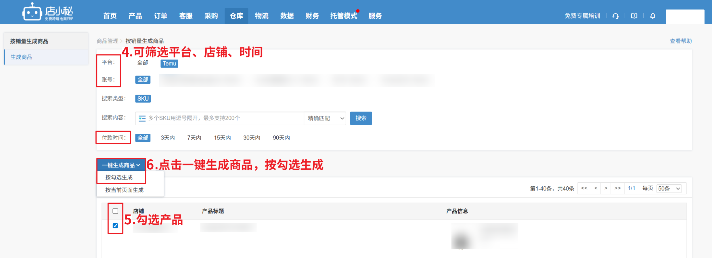 第二步:【选择店铺—可以选择最近付款时间—会显示店铺内有出单的产品SKU—勾选产品SKU—一键生成商品】