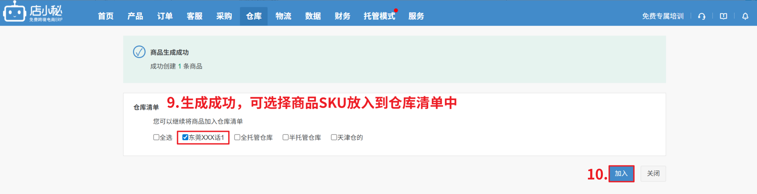 第三步:【完善商品信息—保存—选择该商品要加入的仓库—确定】